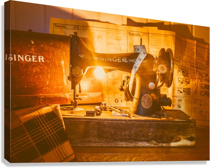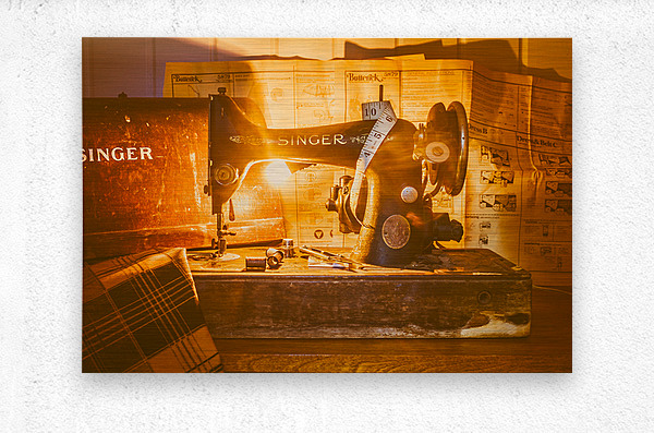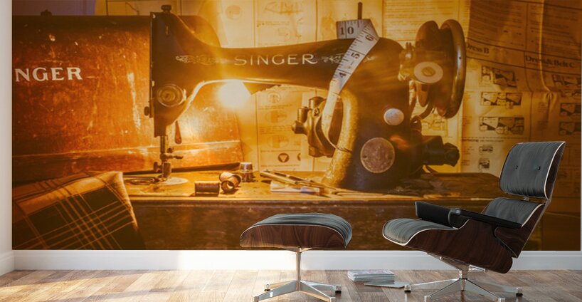 Setting a scene of traditional tailoring a vintage sewing machine set to thread by work light to a paper patterning from the old stitch industry
