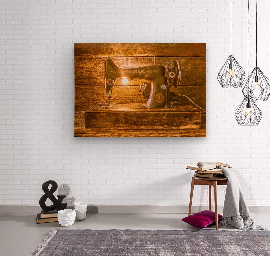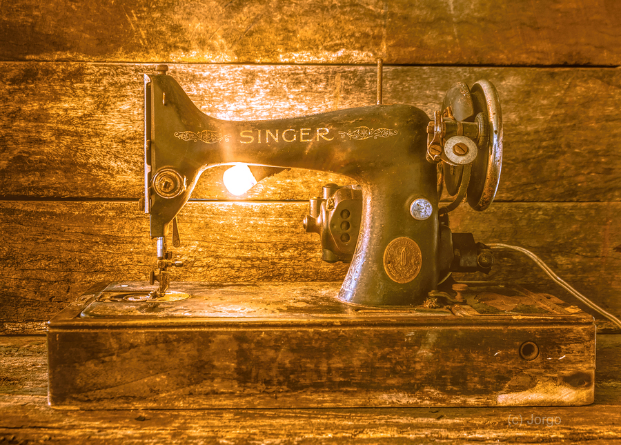 Rustic still-life photography on a old sewing machine lit by a in-build incandescent light crafted on wooden antique background