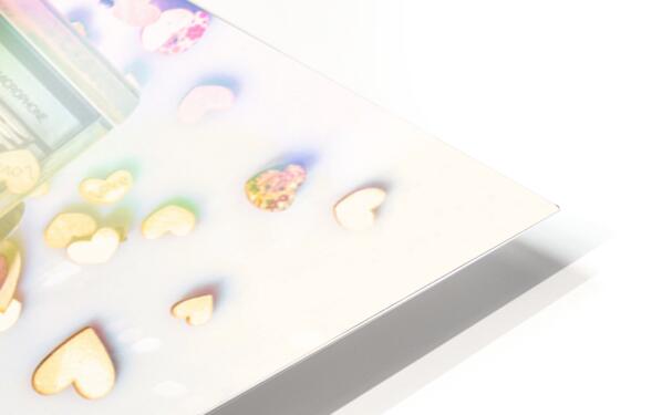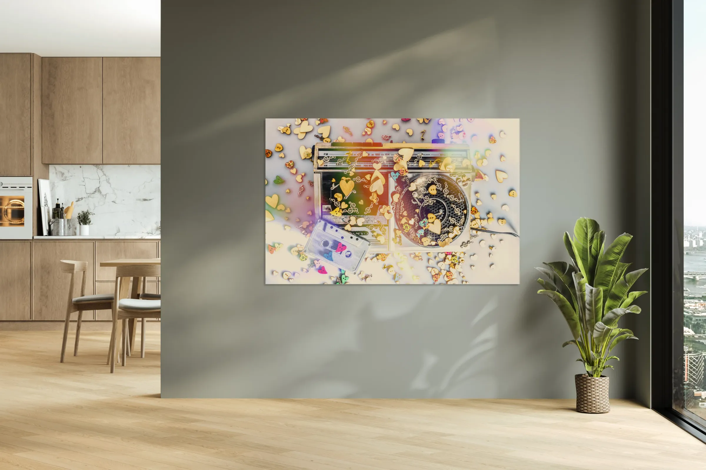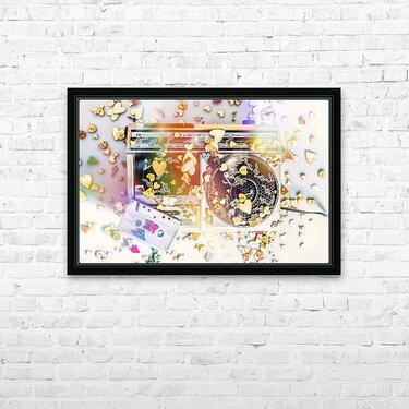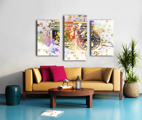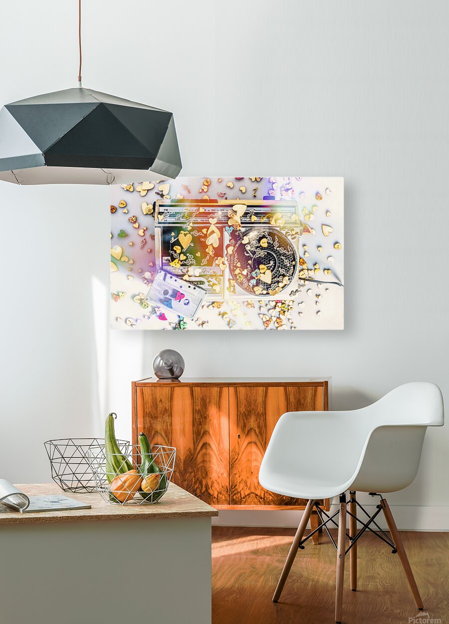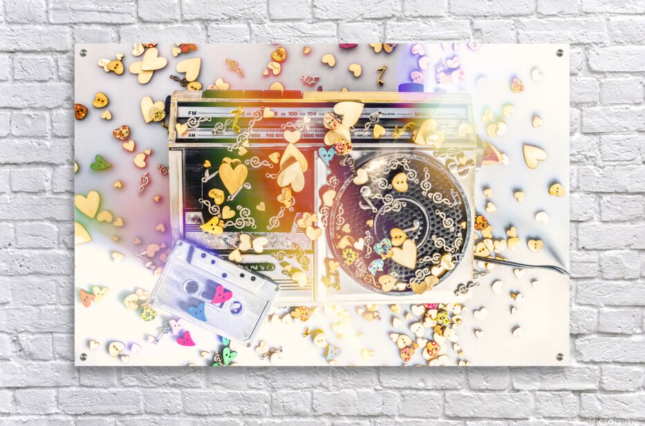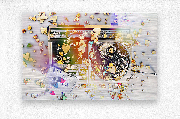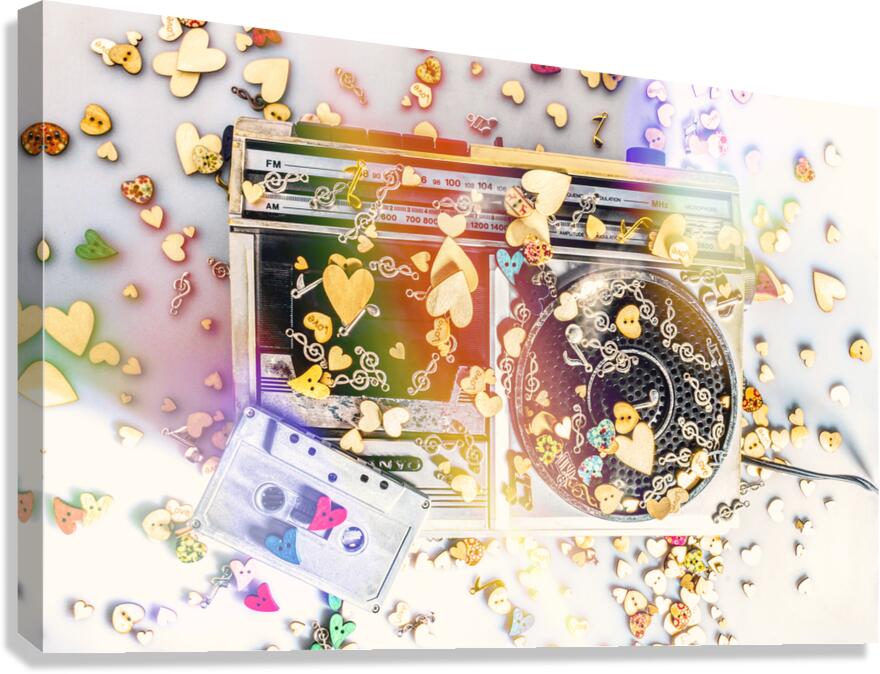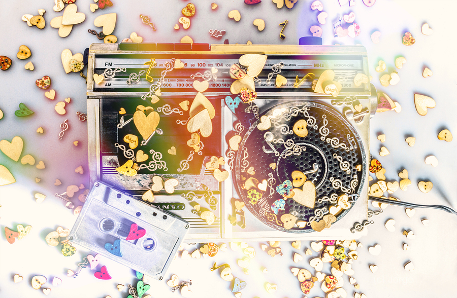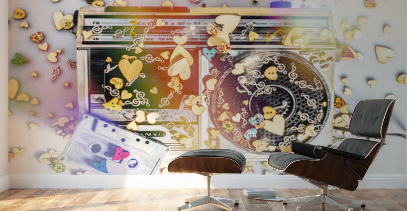A visual melody of music memories with eighties pop art stereo covered in an abstract of flares hearts and musical notes