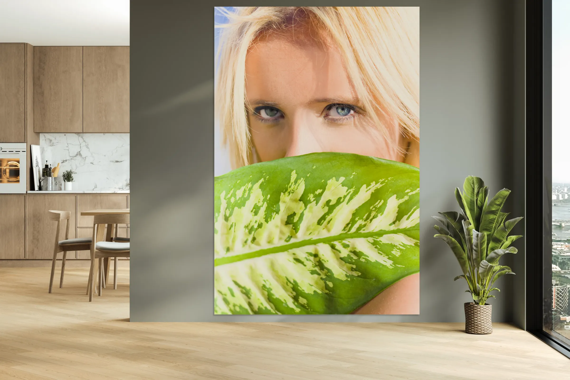 Young Beautiful Blonde Girl With Stunning Blue Eyes Looks Out From Behind Large Green Leaf With Expression Of Mystery And Untamed Passion