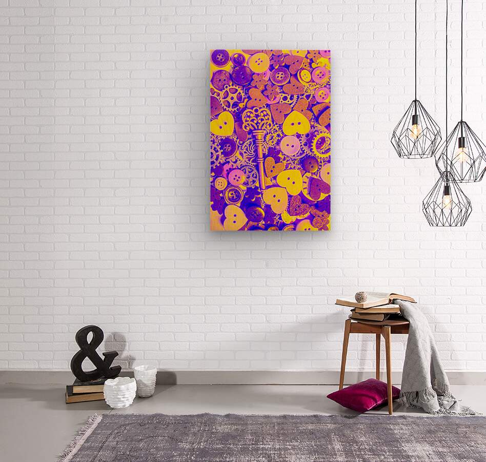 Pop art design on a neon yellow still of button hearts and outdated gearing. Romance in mechanics