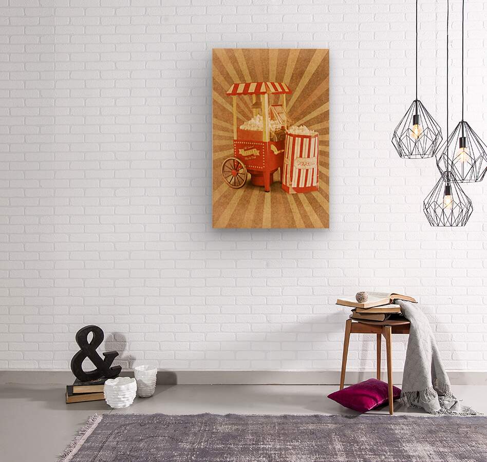 Vintage movie scene in snack bar nostalgia with popcorn cart and old commercial carton. Salted cinema