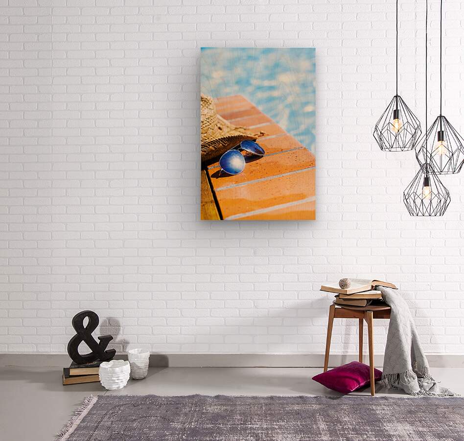 Pair of sunglasses with lens sun flare and straw hat abandoned by a bather on wet tiles alongside a sparkling swimming pool in a summer vacation conce...[+]