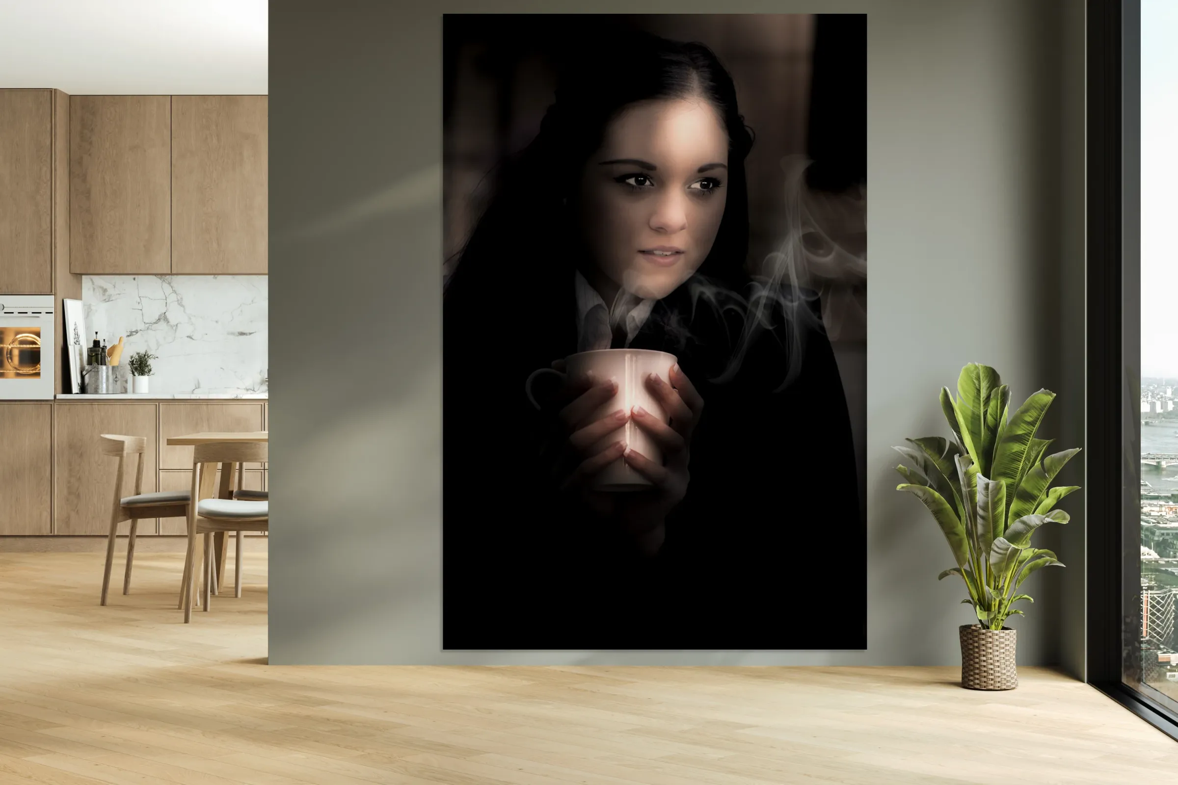 Atmospheric And Lowkey Portrait Of An Attractive Young Brunette Woman Snuggling Up To A Warm Hot Drink As Vapors Of Steam Evaporate Into The Cold Winter Night