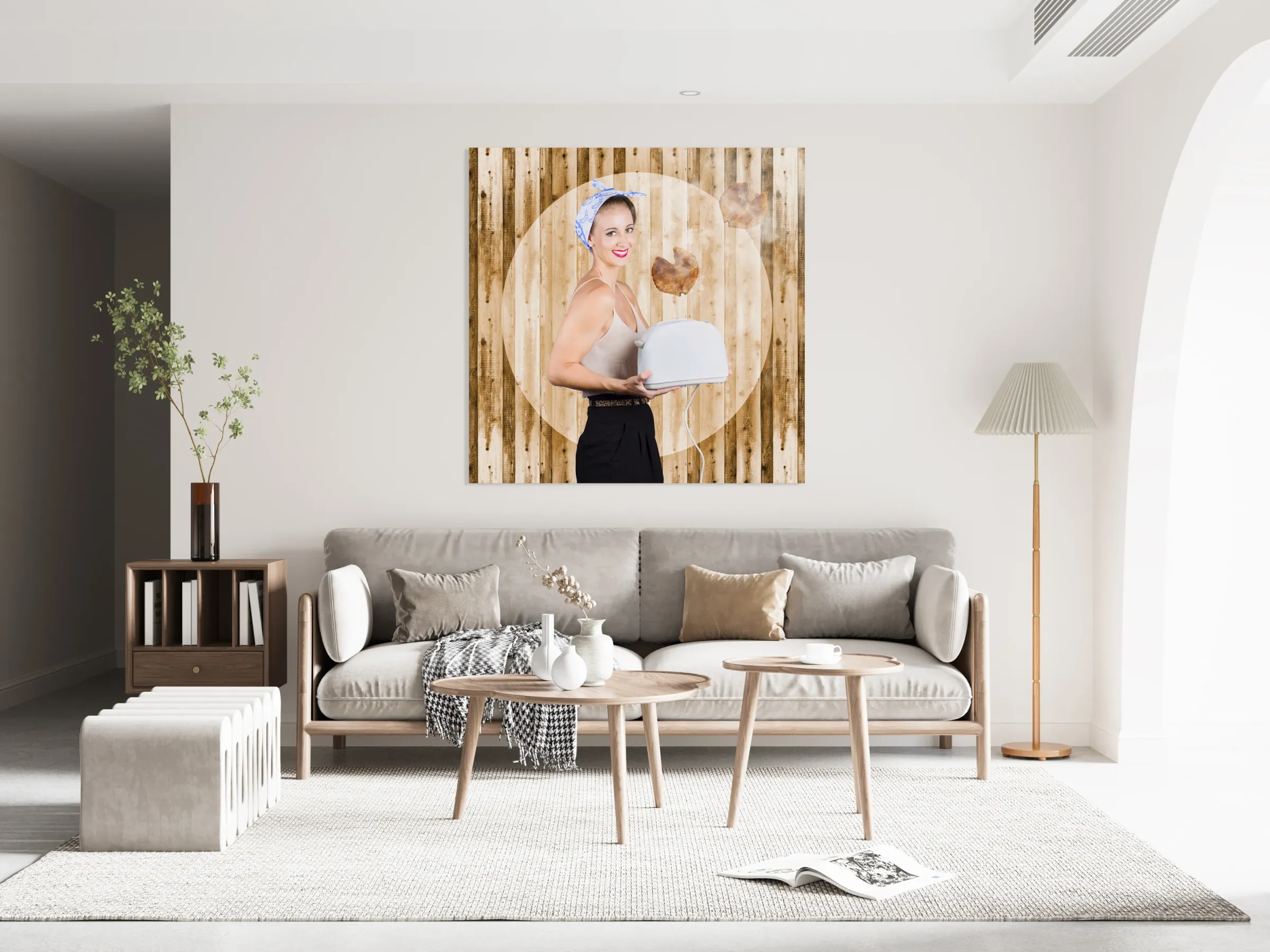 Female breakfast waiter with hot toast in toaster Impression sur bois