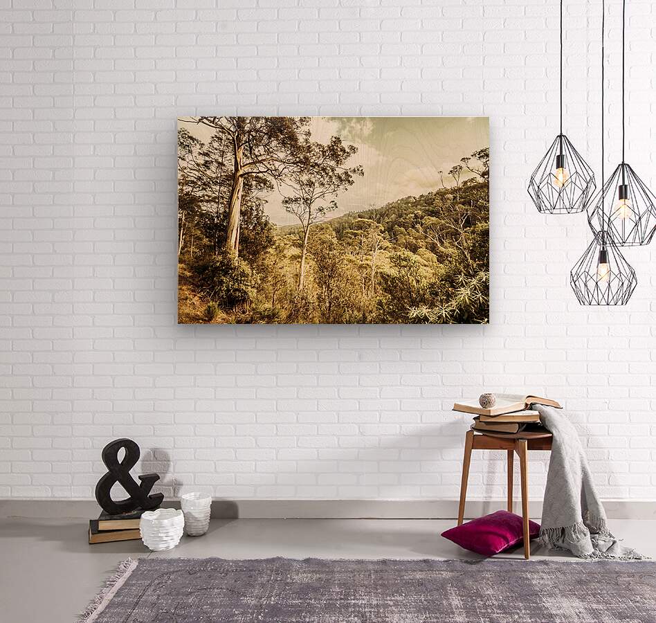 Wide angle vista of a scenic Tasmanian background with native trees in dense scrub. Judbury Australia