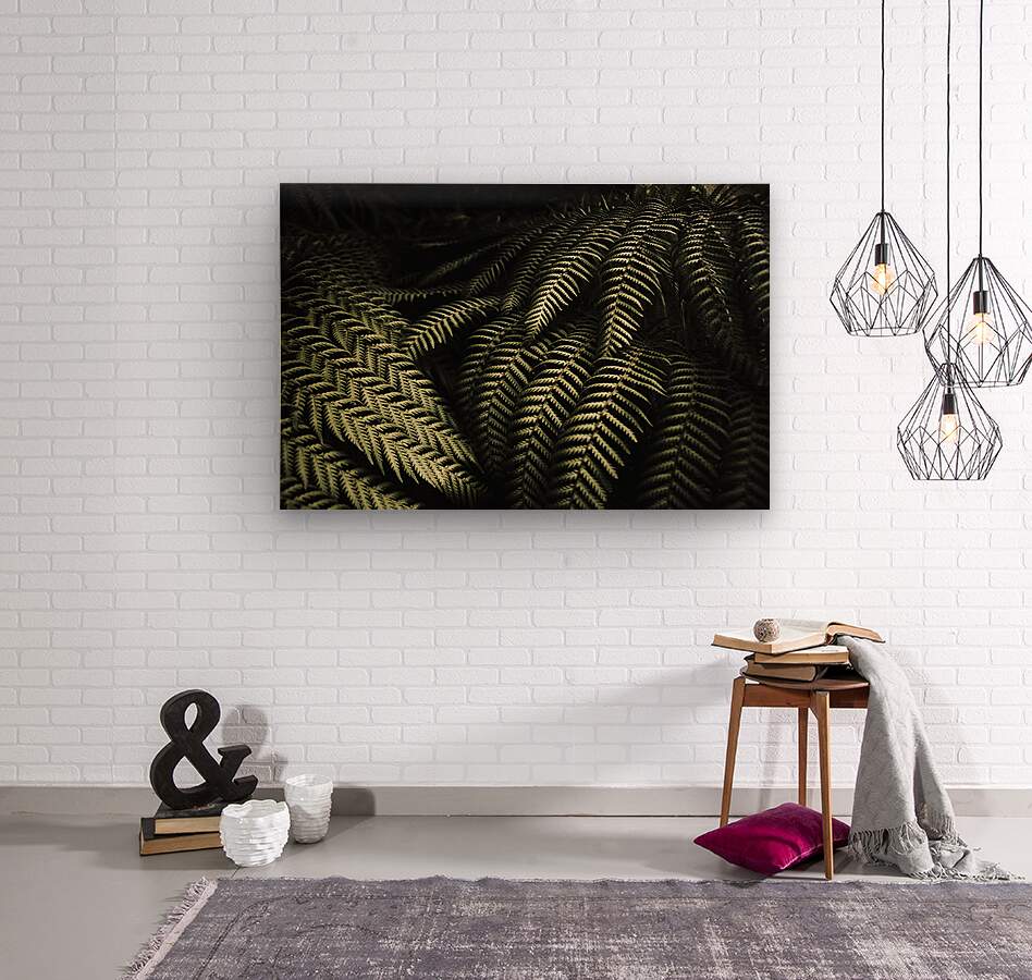 Dark green dramatic photo on the moonlight illuminating the fronds on a dark jungle fern