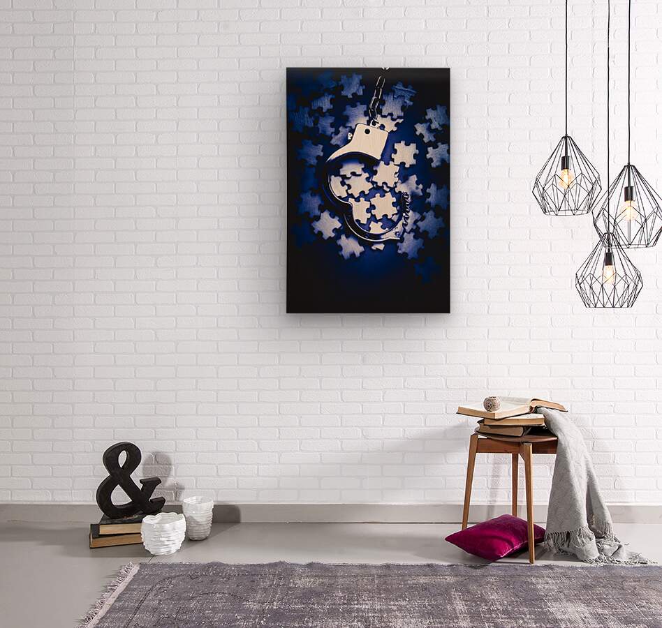 Blue toned still life photo on a scattering of jigsaw puzzles pieces with open cuffs. Open case mystery