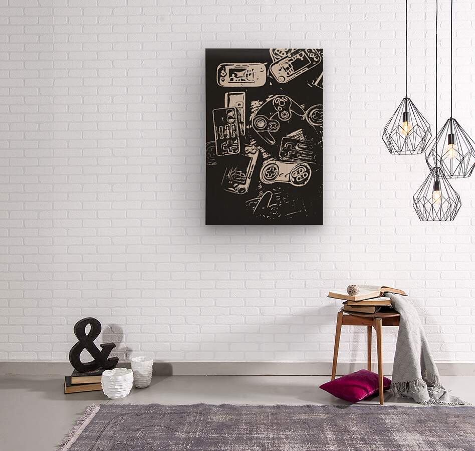 Creative black and white line art on a gathering of computer game control pads. Game play in blocks and lines