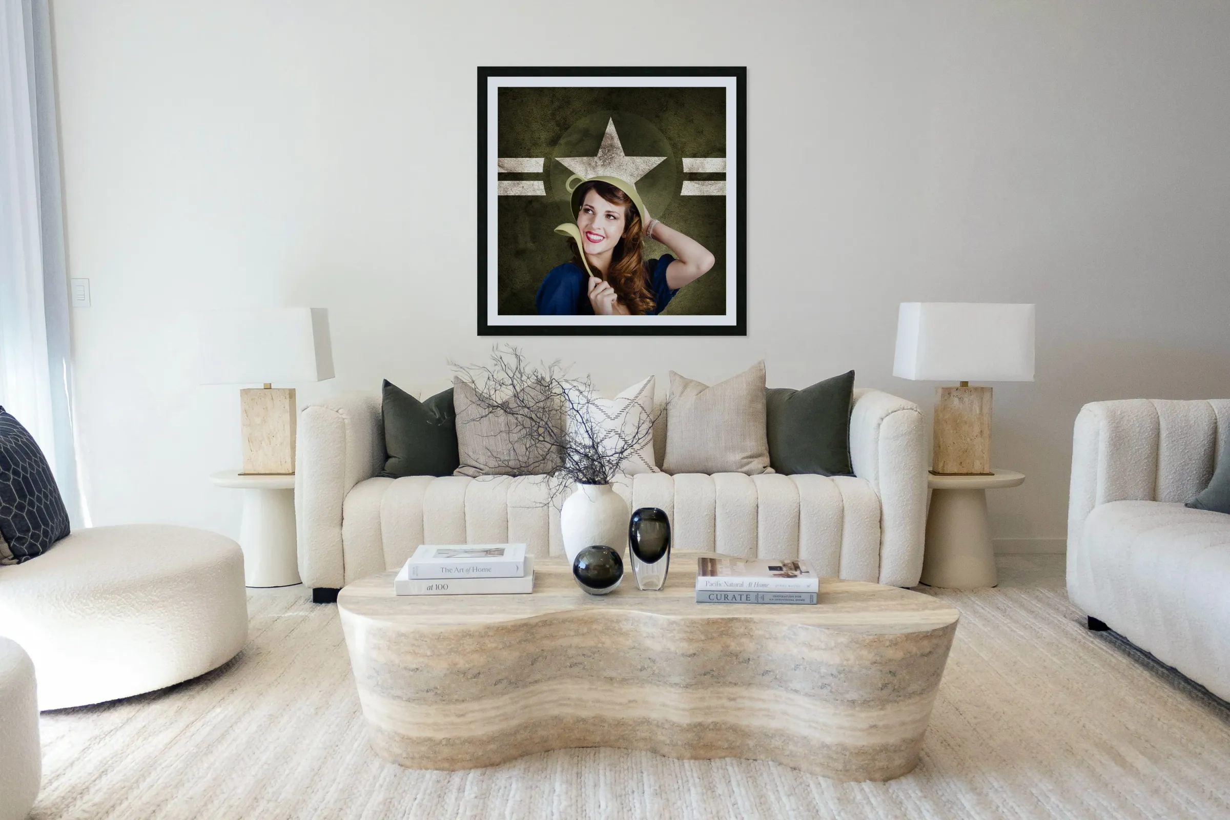 SUR CETTE OEUVRE: CUTE MILITARY PIN-UP WOMAN ON ARMY STAR BACKGROUND