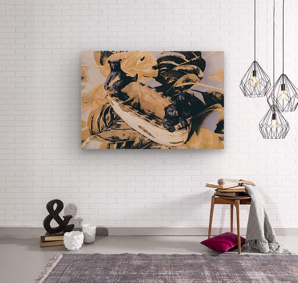 Vintage styled art scene on a boat of travelling bears rowing up leafy lake