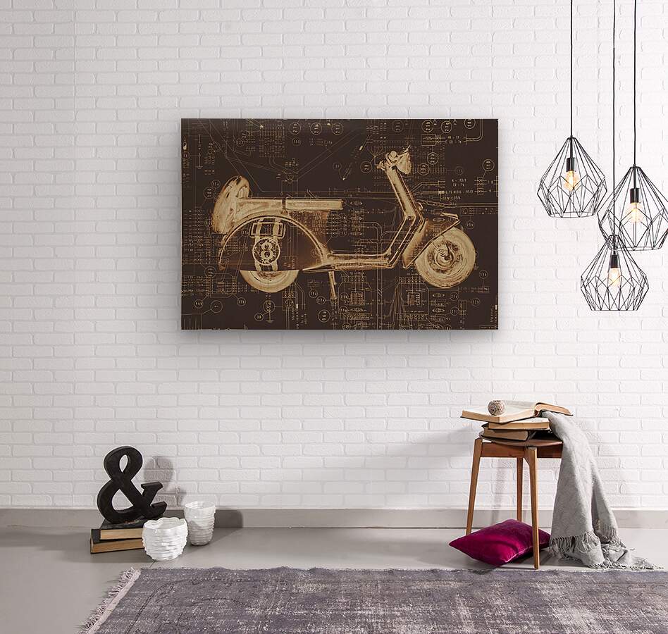 Factory art on a complex machine blueprint with a complex array of bike parts assembly and mechanisms. Scooter specs