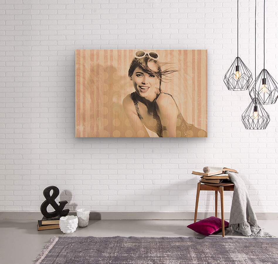 Old style edit of a hot pin up model with wind swept fringe on summer wallpaper background. Vintage female portraits