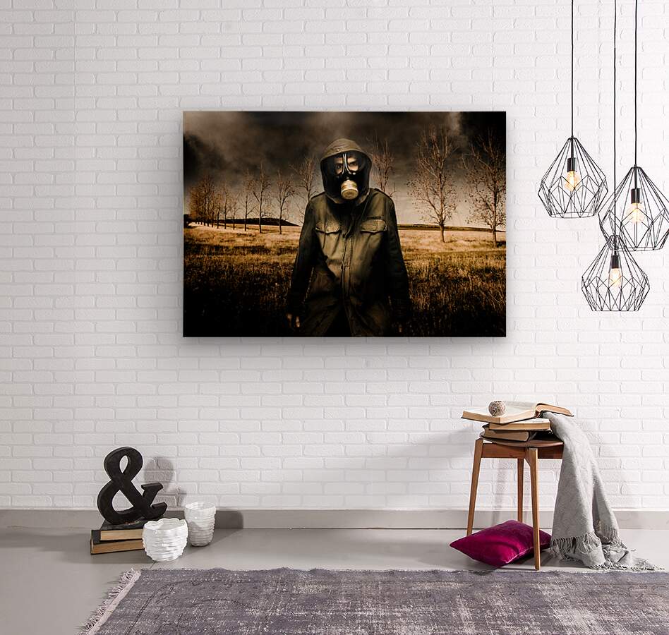 Military Fighter Standing In A Dead Autumn Field As Contaminated Poisonous Air Falls From The Sky During An Attacking Air Raid Bomb