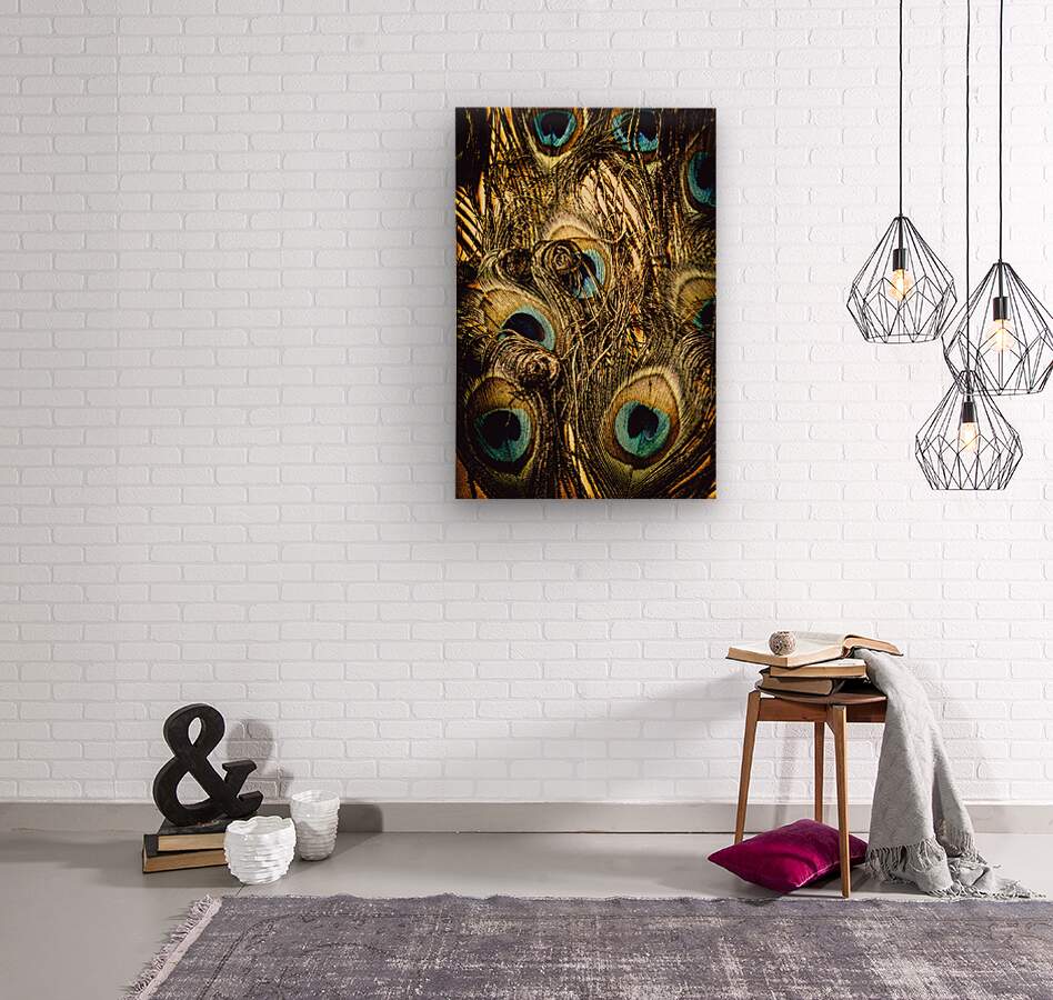 A close-up photograph captures the intricate details of peacock feathers showcasing their vibrant colors and captivating textures. The intricate patterns and textures of the feathers are highlighted in a harmonious palette of natural tones creating a captivating visual experience.