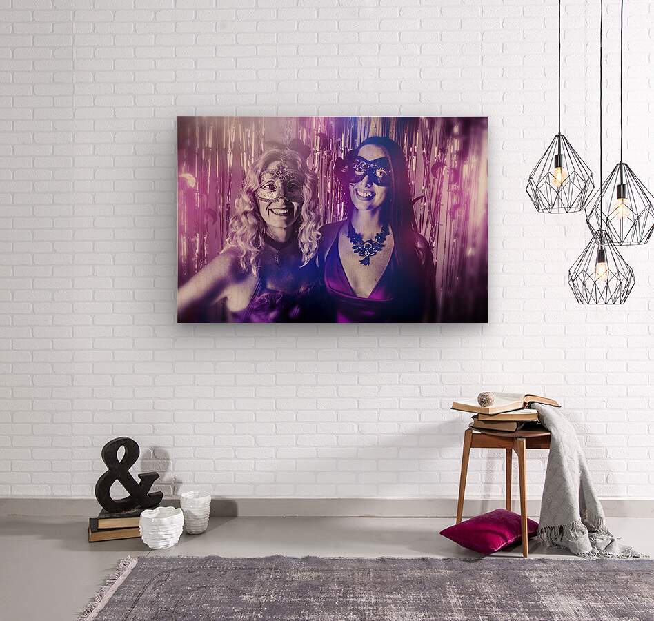A dreamy scene of carnival gleam with lovely masquerading women dressed in masks before a curtain of silver shine