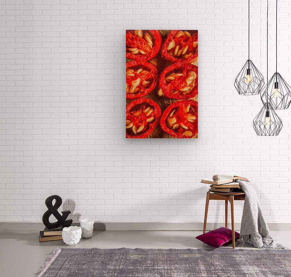 A closeup digital painting on sliced red chillies on kitchen chopping block