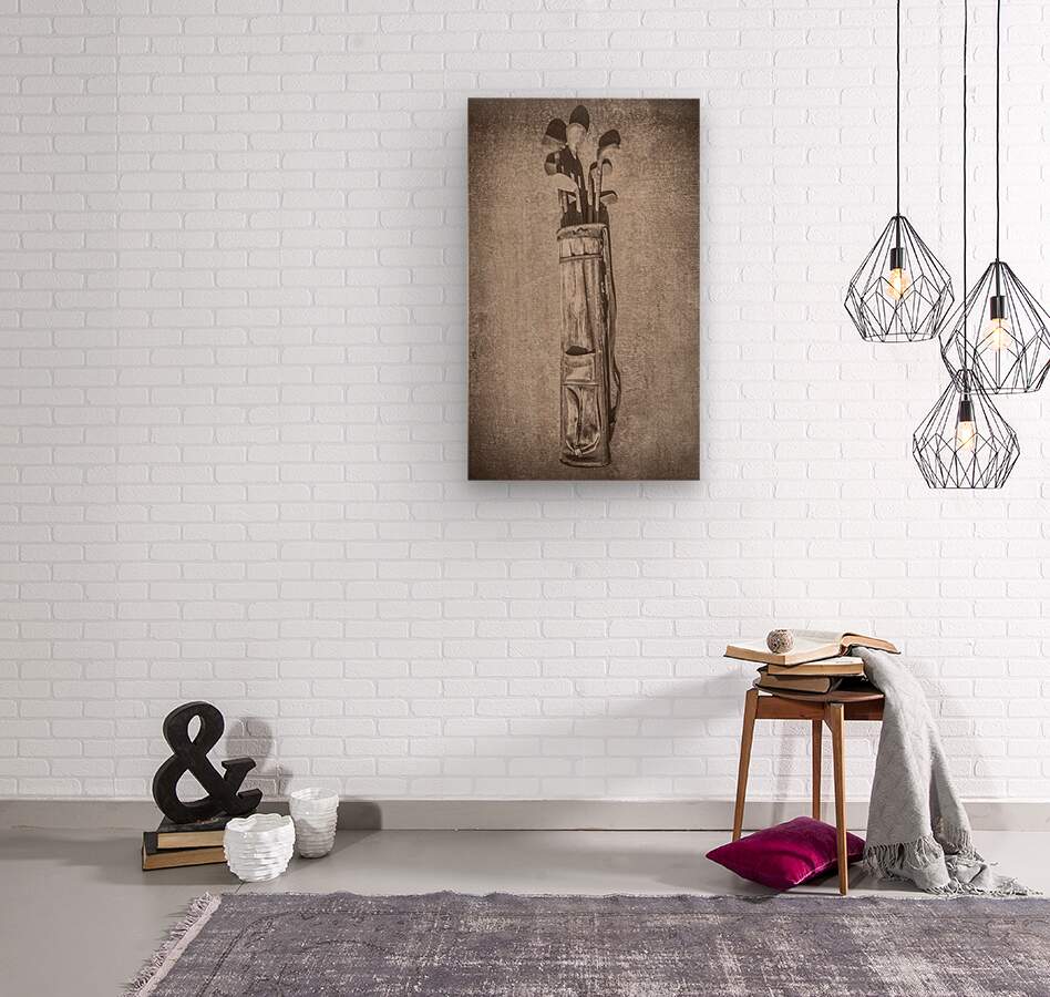 Old golf minimalism in a scene of weathered golf bags and antique wooden clubs centred and cemented in sepia