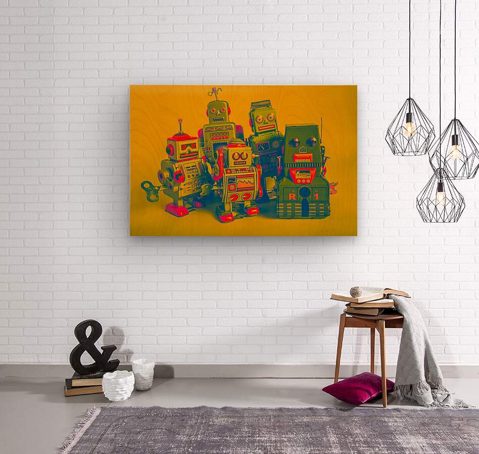 Retro antiques in collectable still life with tin toy robots in faded orange style