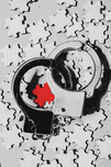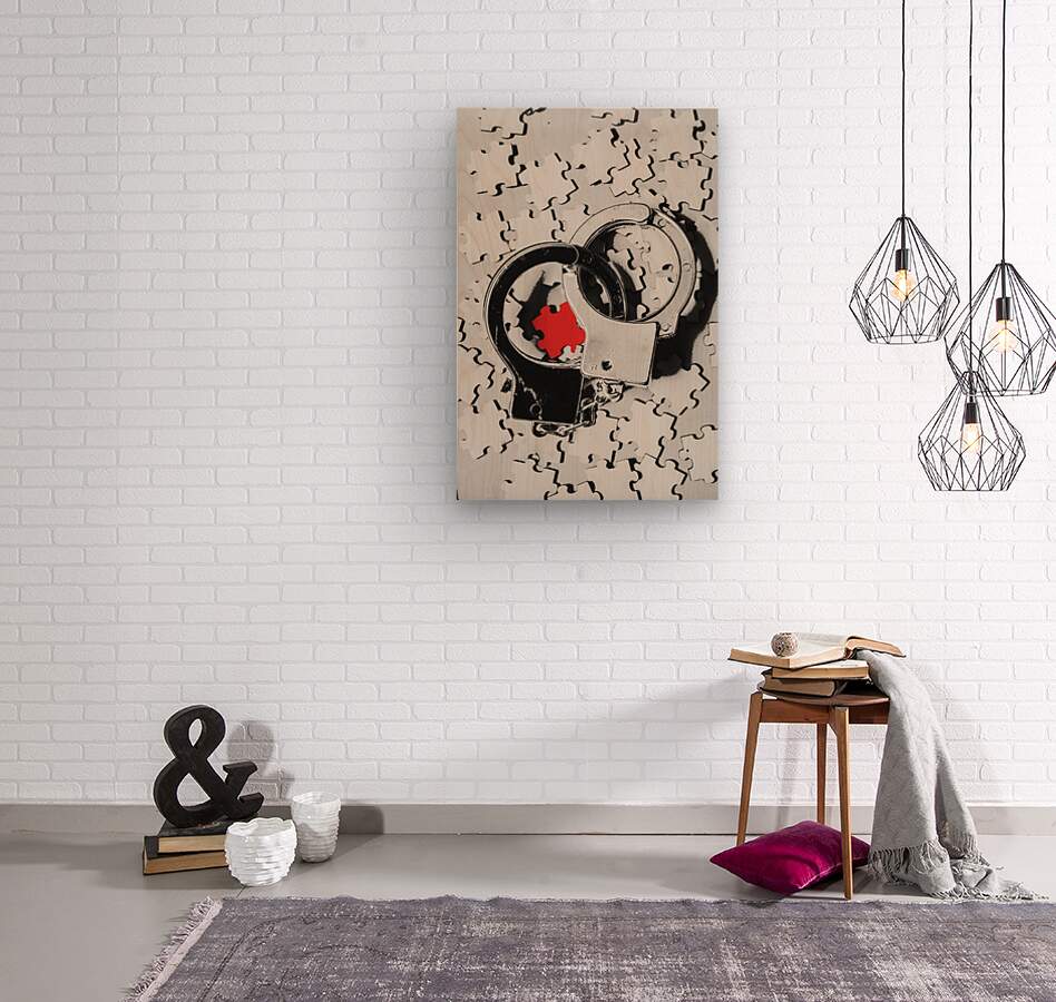 Crime book cover concept on a red clue over the shackles of a closed case in criminology. The missing puzzle piece