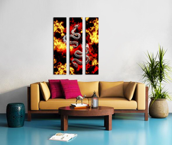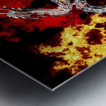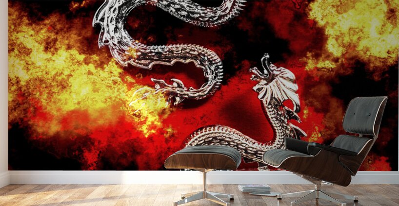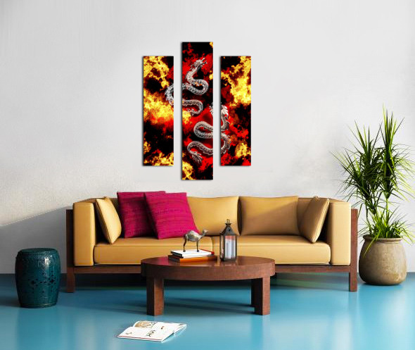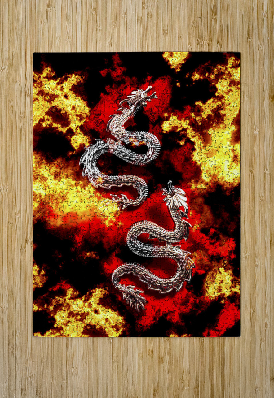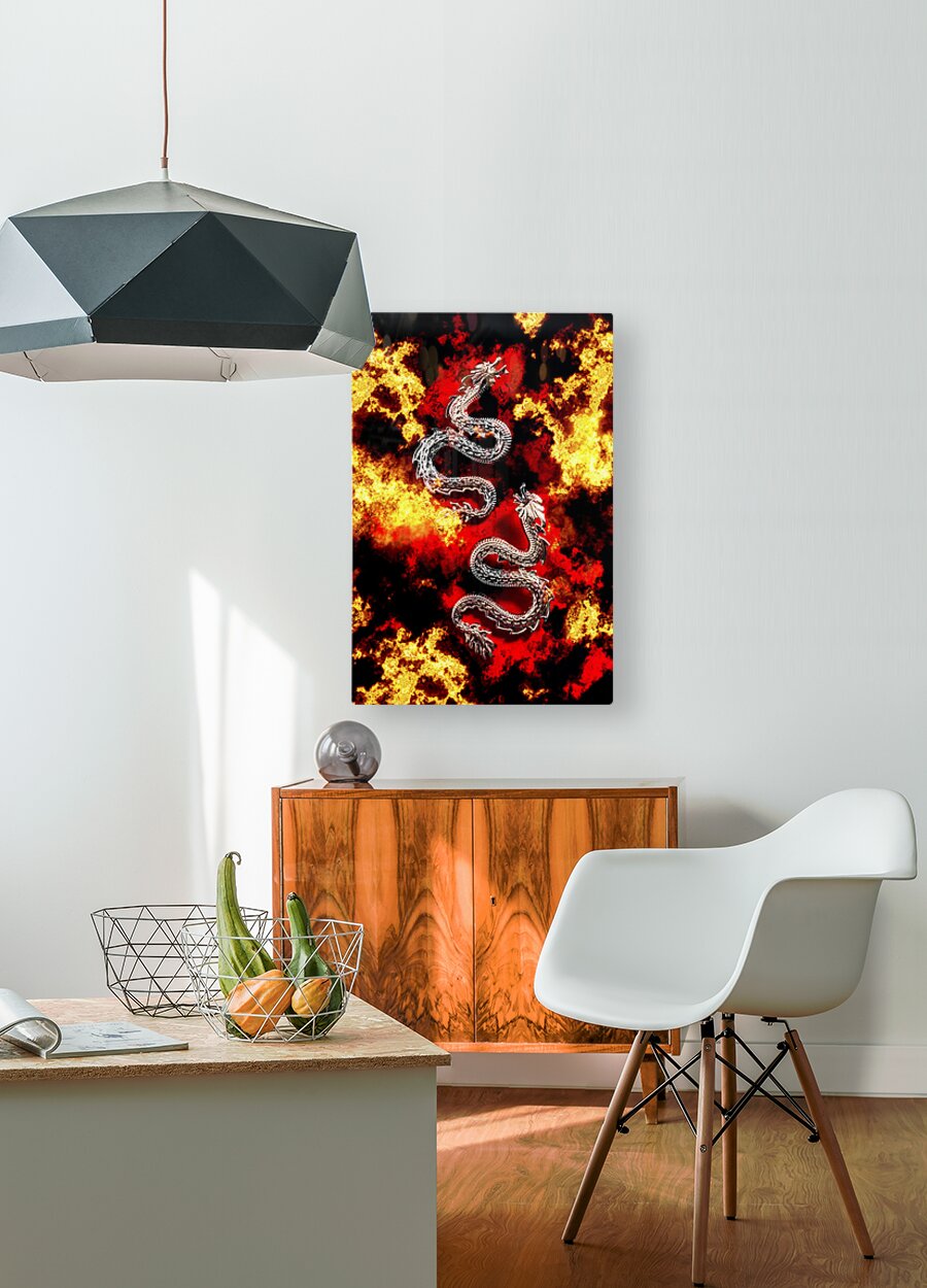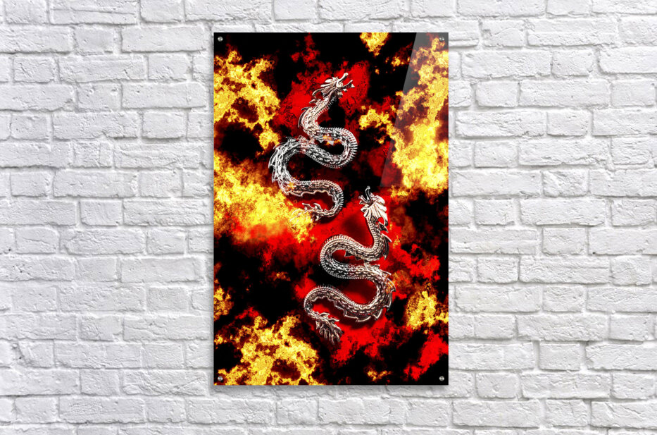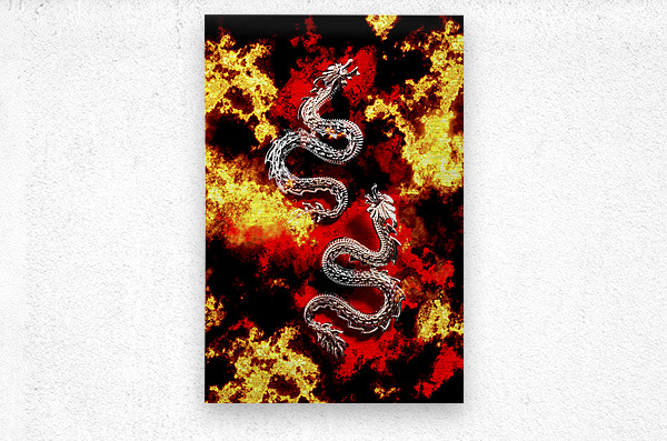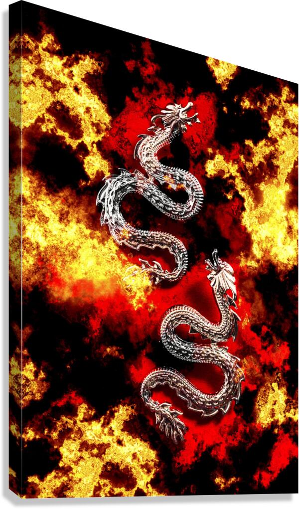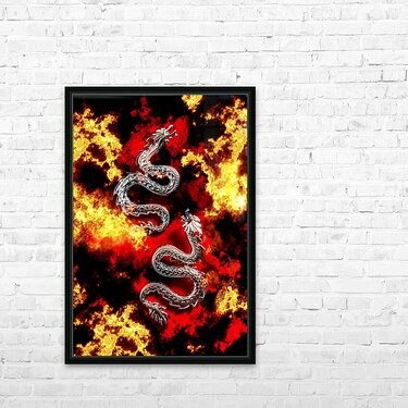 Silver serpent dragons tailing in twos among the fire and brimstone of myth and mystery