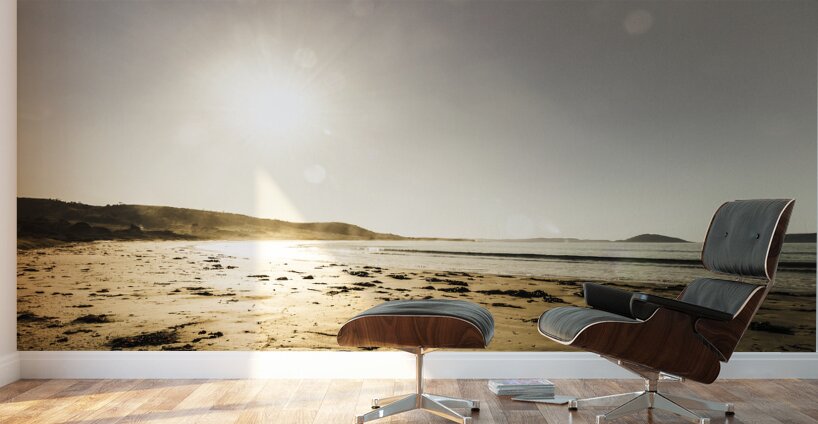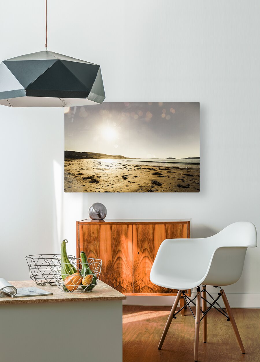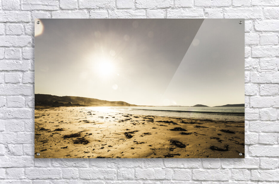 Sun spot and bright rays illuminate a beach scene with vast sky copy space. Kelvedon Beach Tasmania Australia