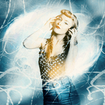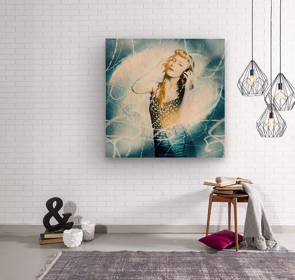 Digital design of a pinup dancing girl in stereo headset moving in a motion of abstract light blurs. Dance music festival pinup