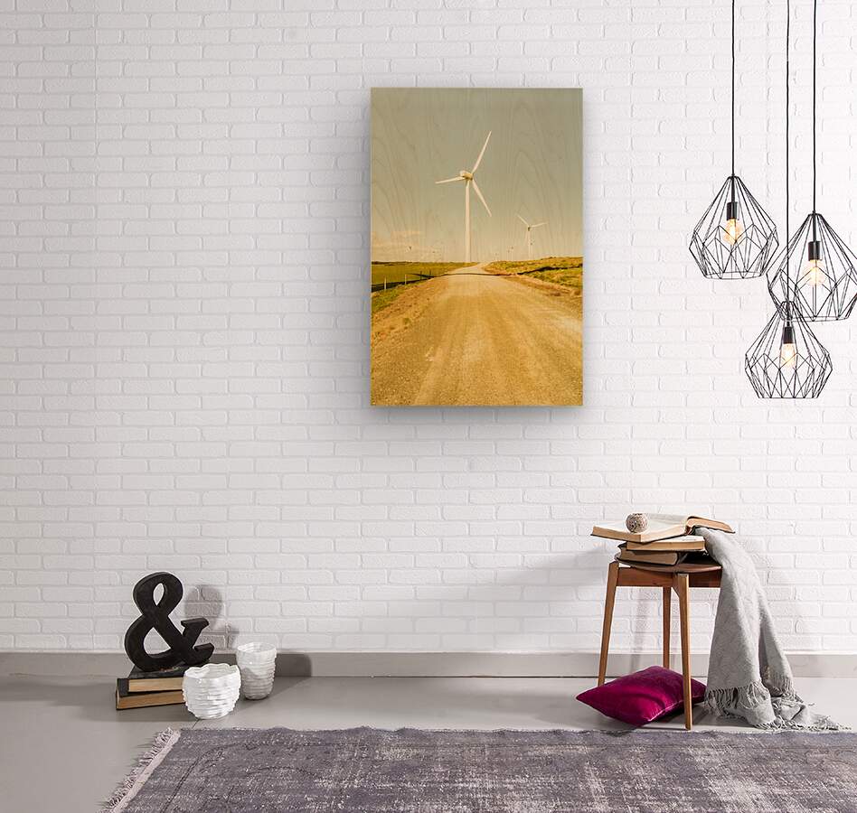Retro landscape on a dirt road under the skies of sustainable wind turbine farming. Woolnorth Tasmania Australia