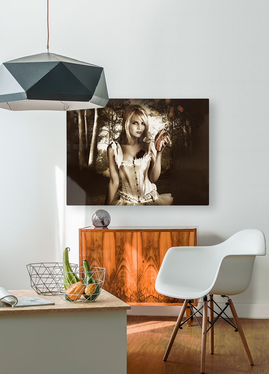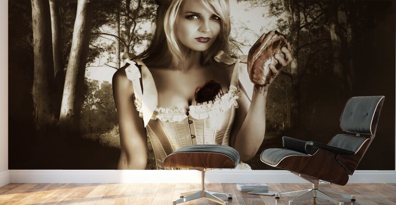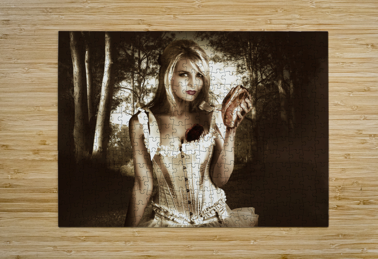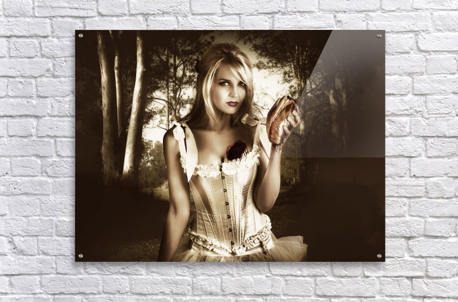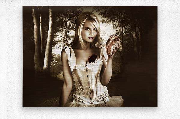 Dramatic Portrait Of An Emotional Blond Woman Standing In A Dark Forest Holding Her Own Bleeding Heart After Ripping It Out Of Her Chest In A Separati...[+]