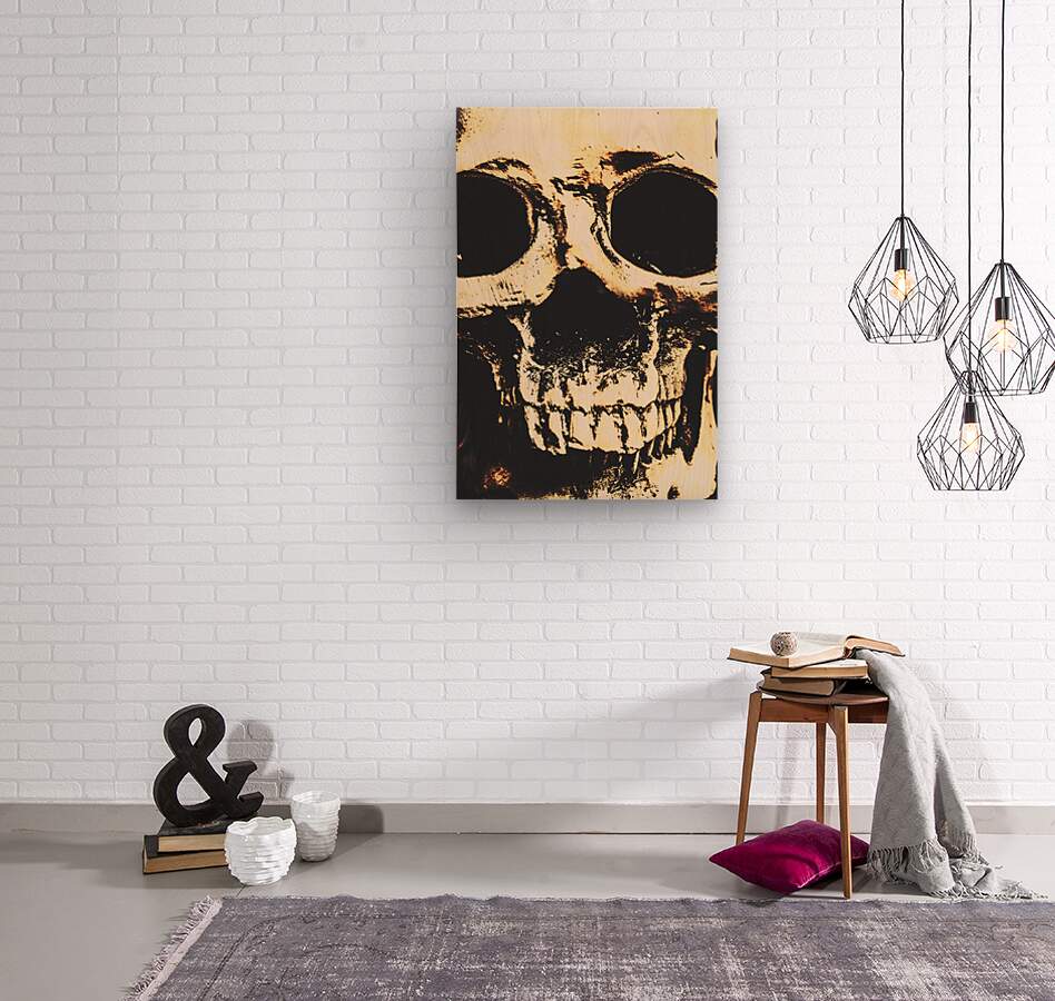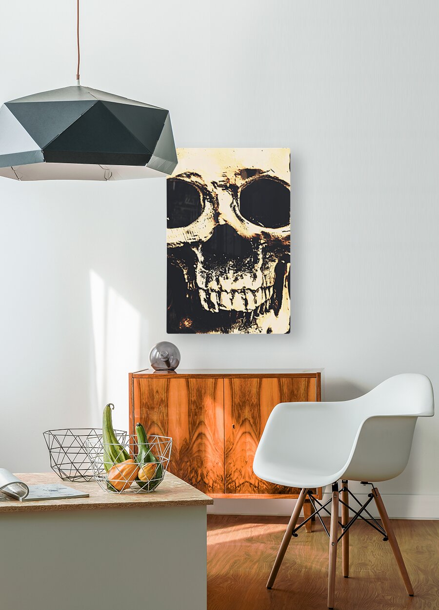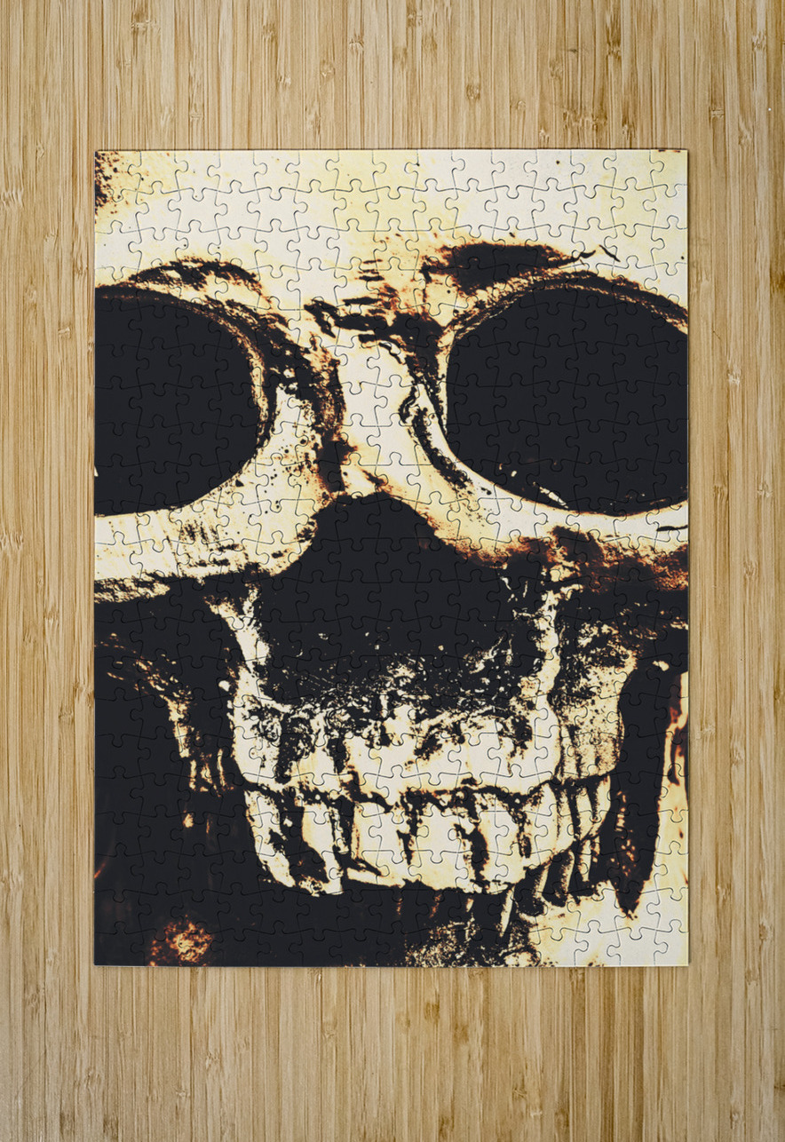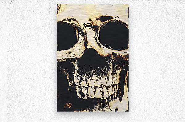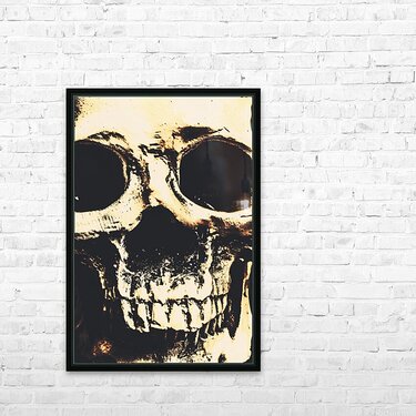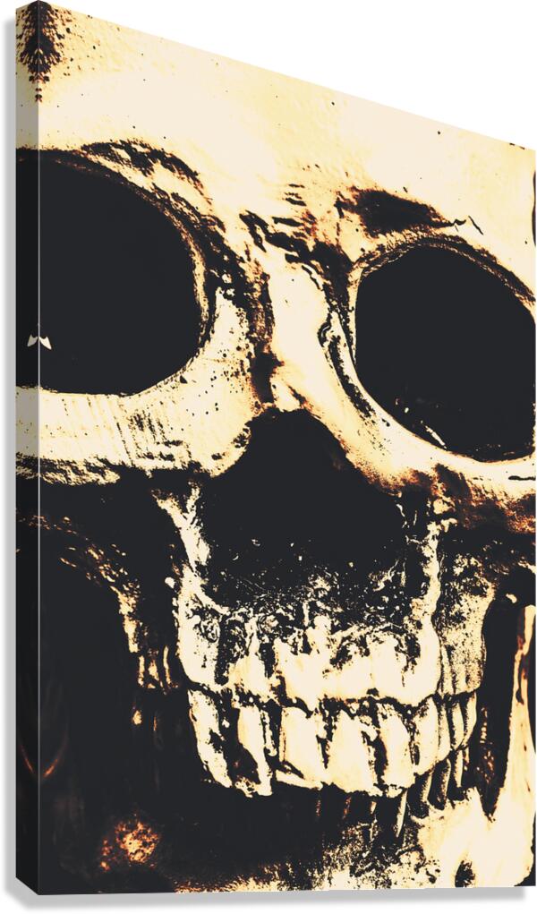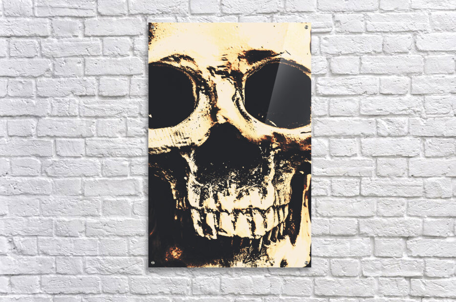 Spooky still life artwork on a smiling skull face in vintage grunge style