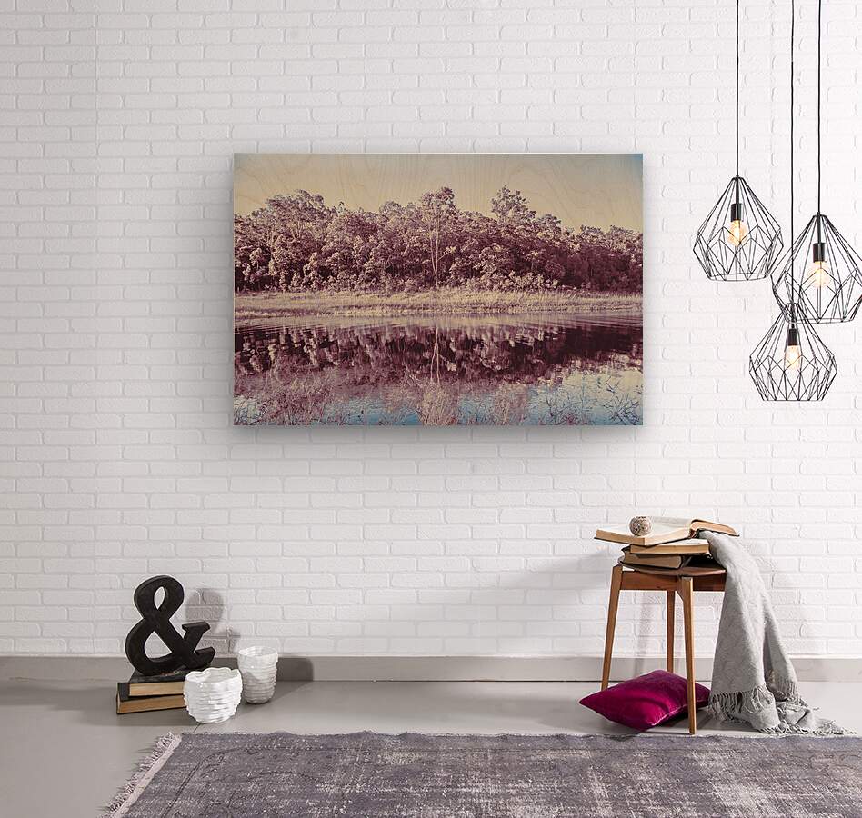Creative infrared landscape art on a reflective scene of Australian countryside with frost-burn trees and ice lakes. North Pine Dam Petrie Queensland Australia