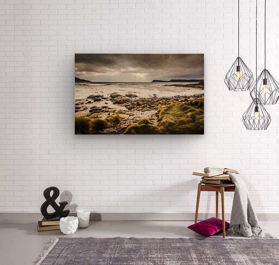 Intense wide-angle landscape picture on the stoney coastal shores of Bruny Island Tasmania. Storm clouds over Cloudy Bay