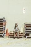 Portrait of retro man dreaming up thoughts of inspiration with typewriter on lap. Literary loading