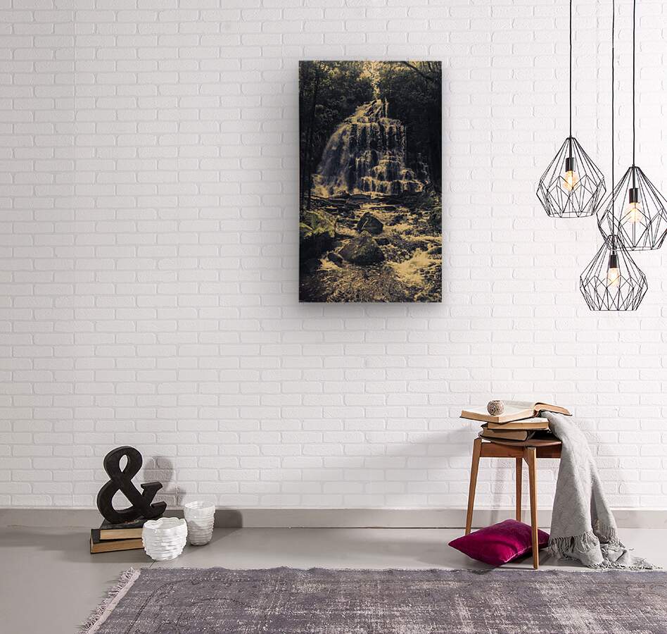 Vertical falls artwork on a blue tone temperate forest waterfall in harmonious detail. Nelson Falls Franklin-Gordon Wild Rivers National Park Western ...[+]