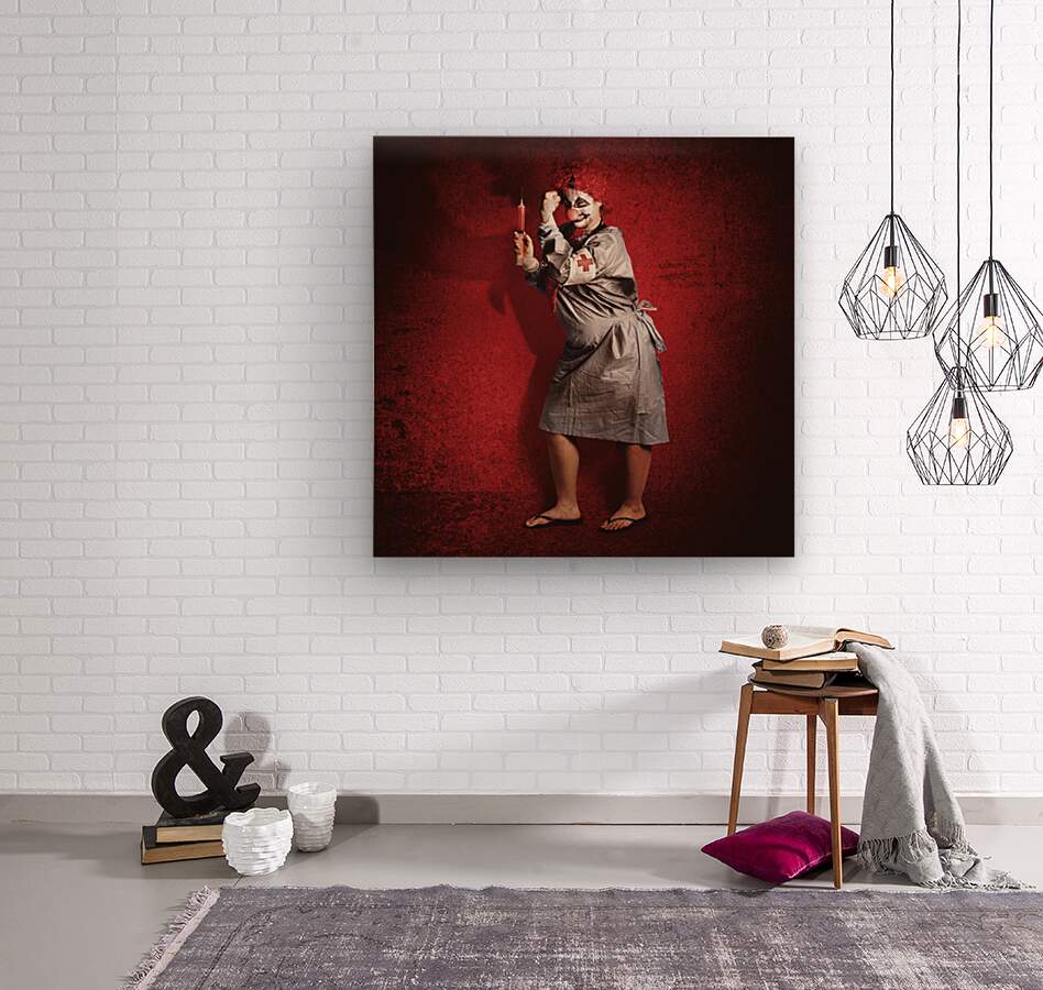 Get this artwork "Scary clown doctor about to give jab with syringe" in a framed print.