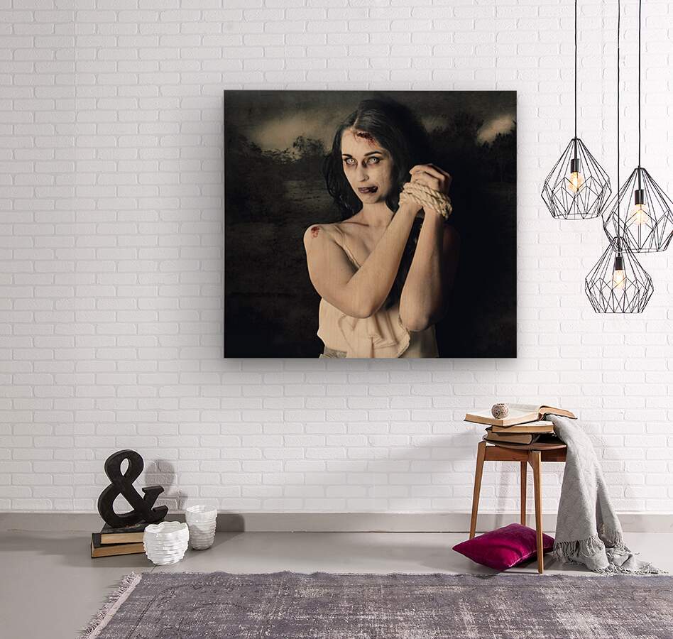 Get this artwork "Dark horror scene of an evil zombie woman tied up" in a framed print.
