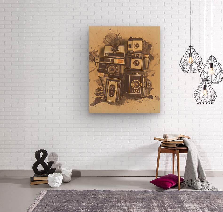 A scene in development with vintage film cameras and sprays of optical emulsion