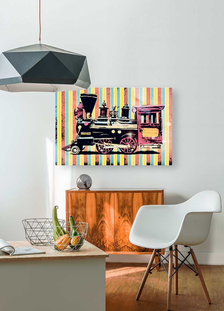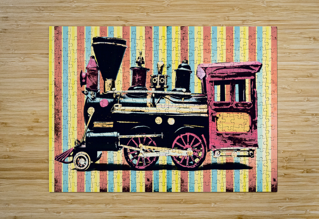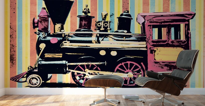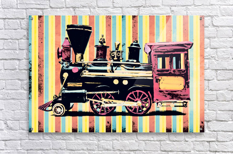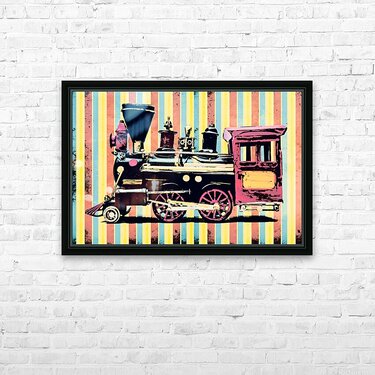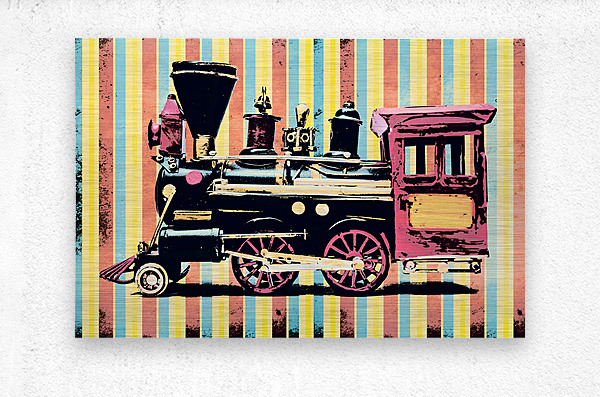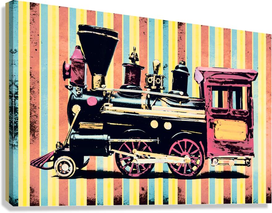 Retro stylised pop art on a tin toy train in striped cartoon dynamics. Comic carriageway