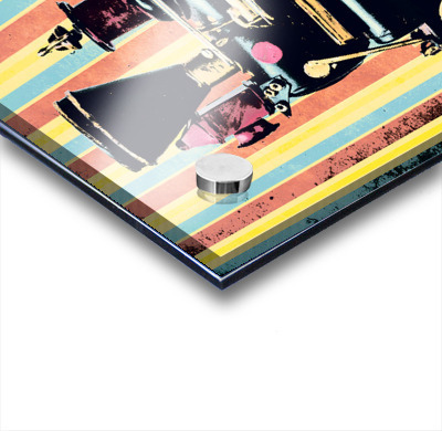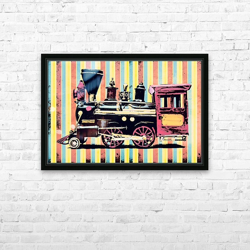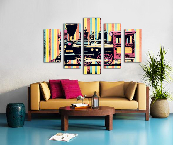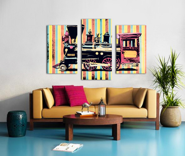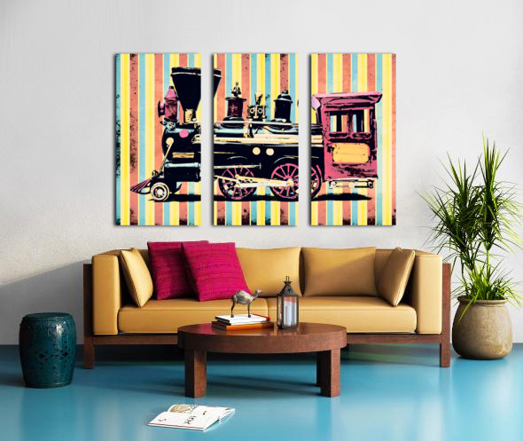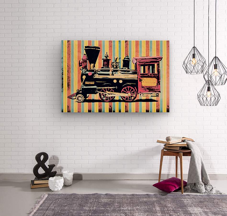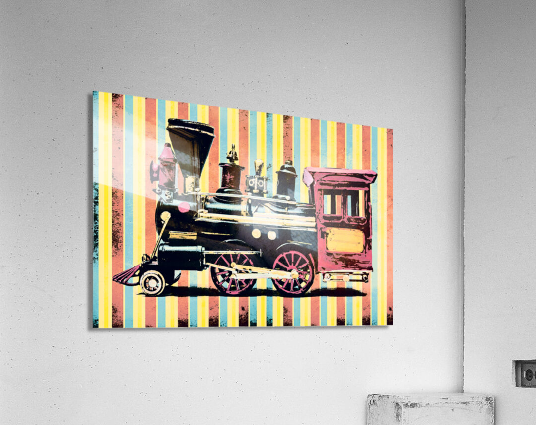 Retro stylised pop art on a tin toy train in striped cartoon dynamics. Comic carriageway