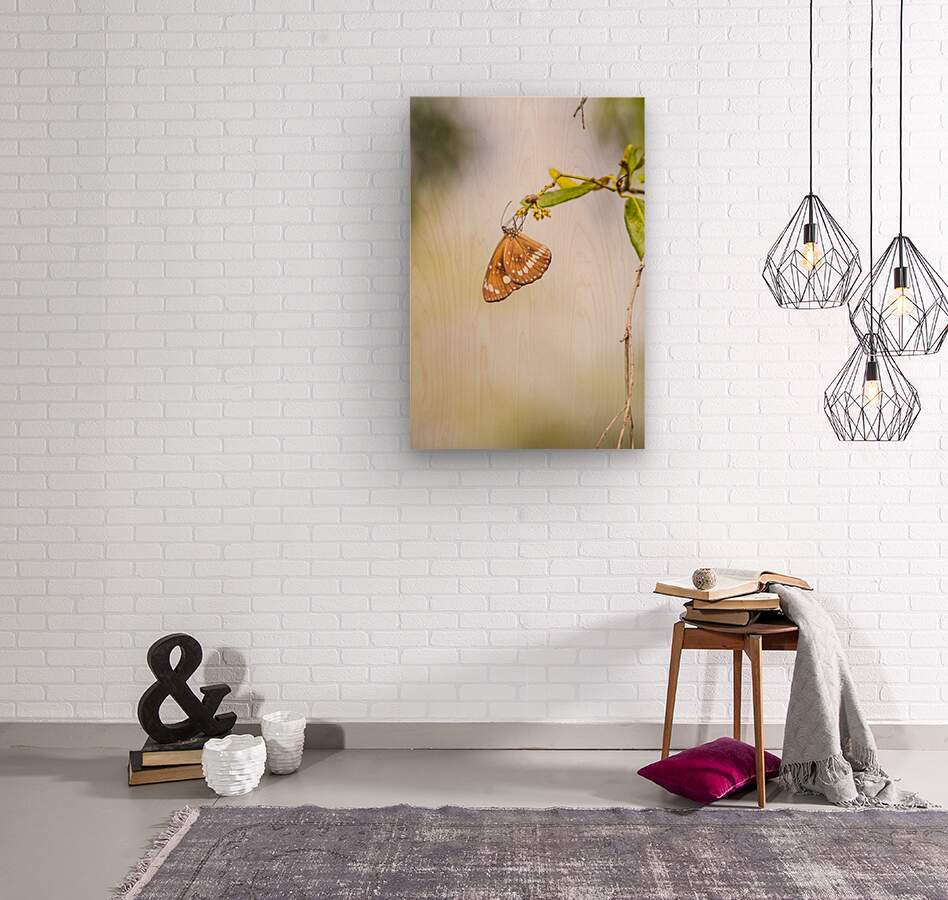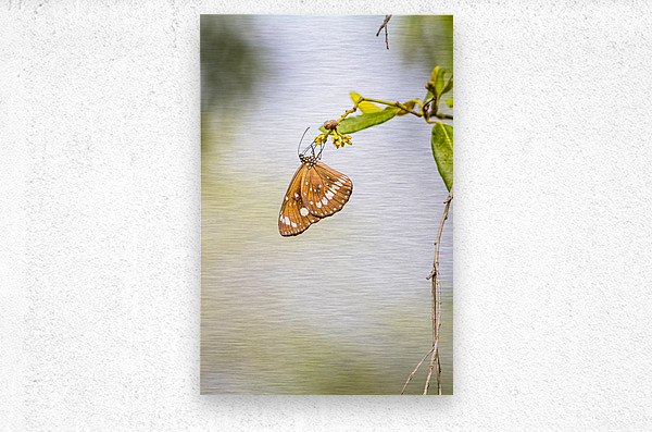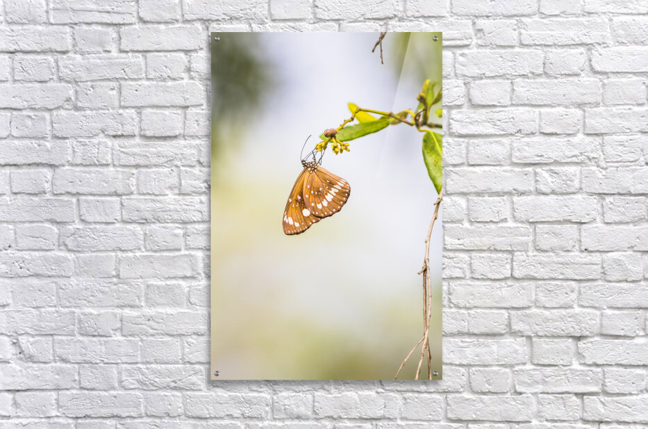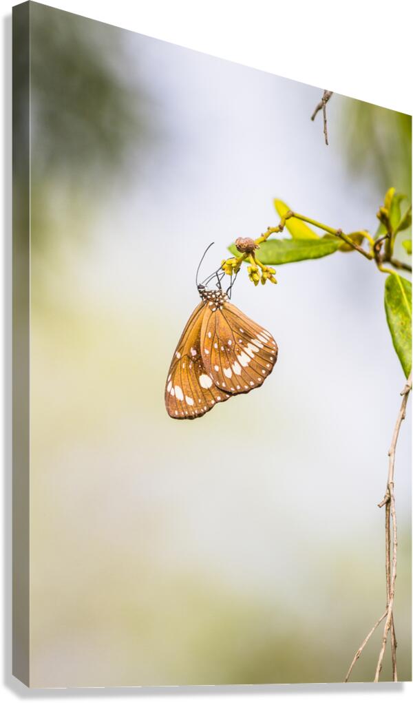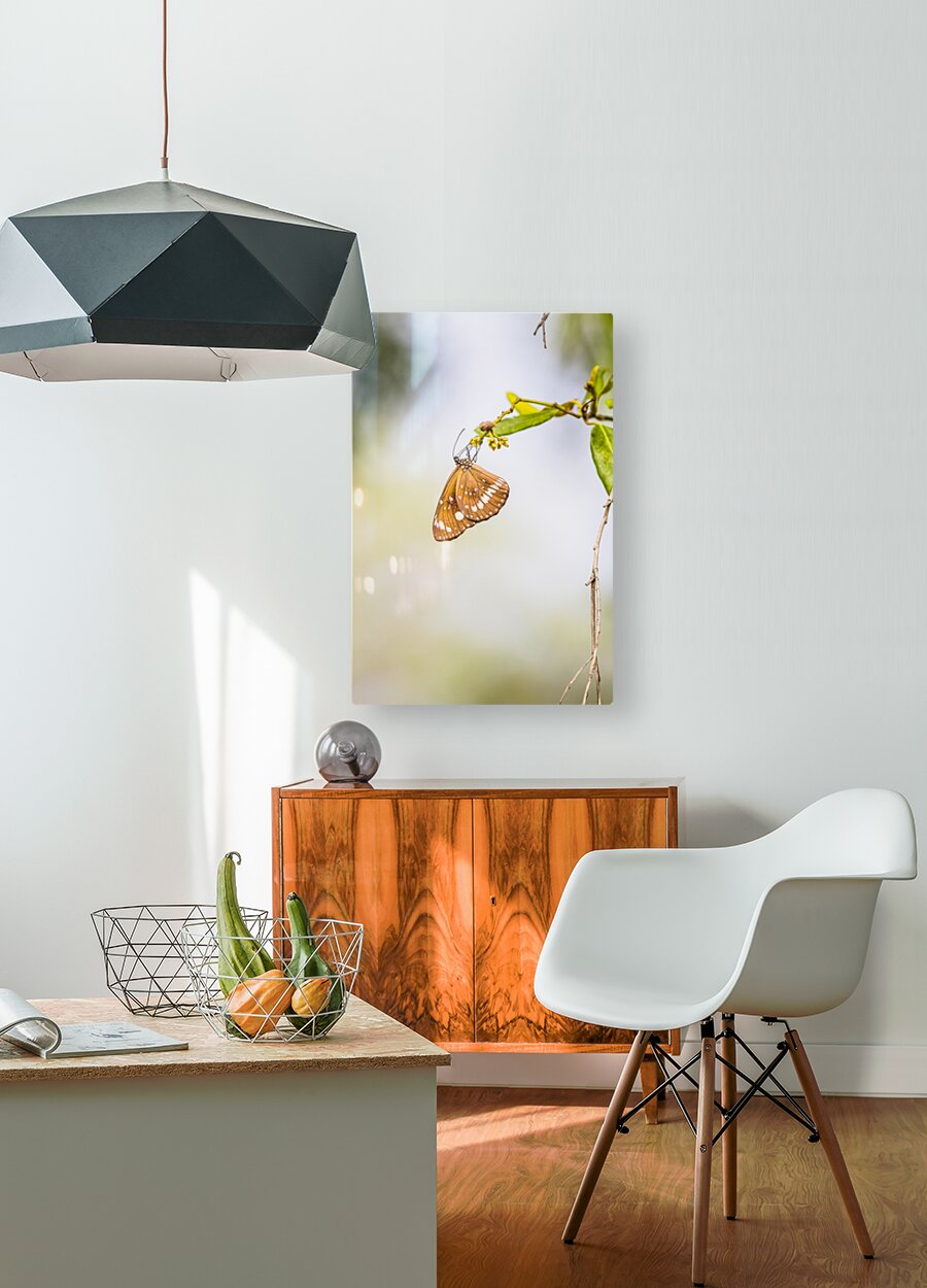 Nature fine art on a common crow butterfly hanging from foliage minimalism. Wild simplicity