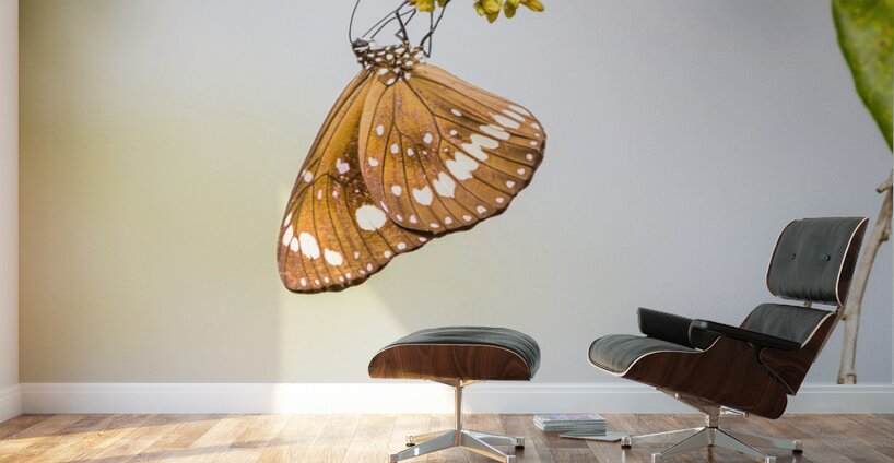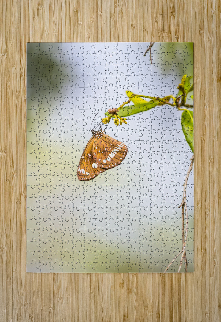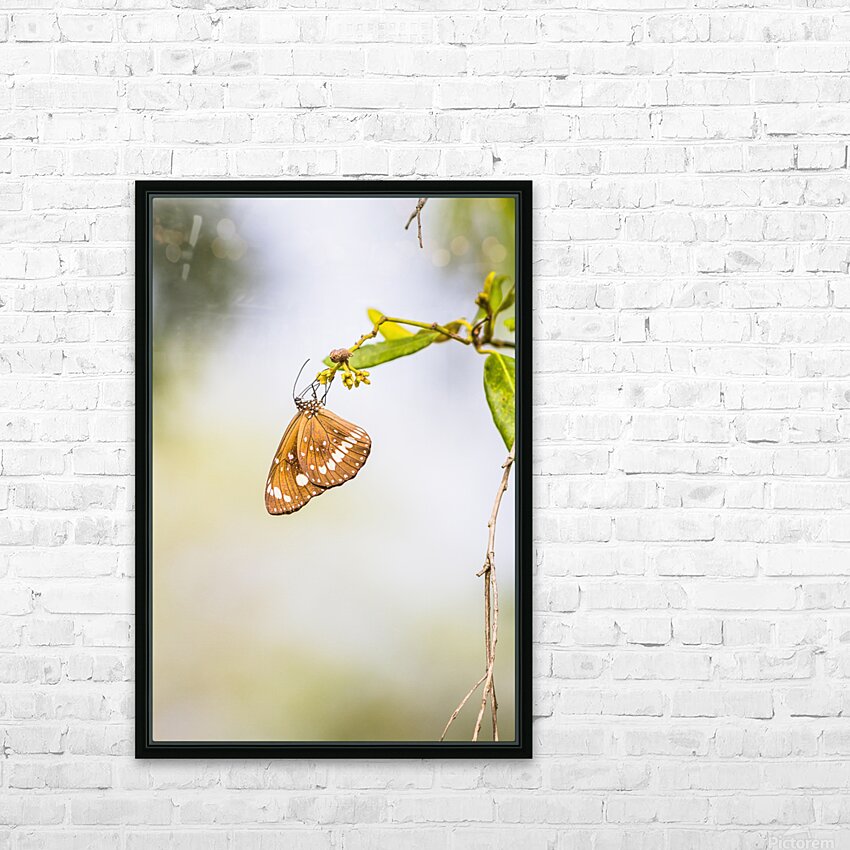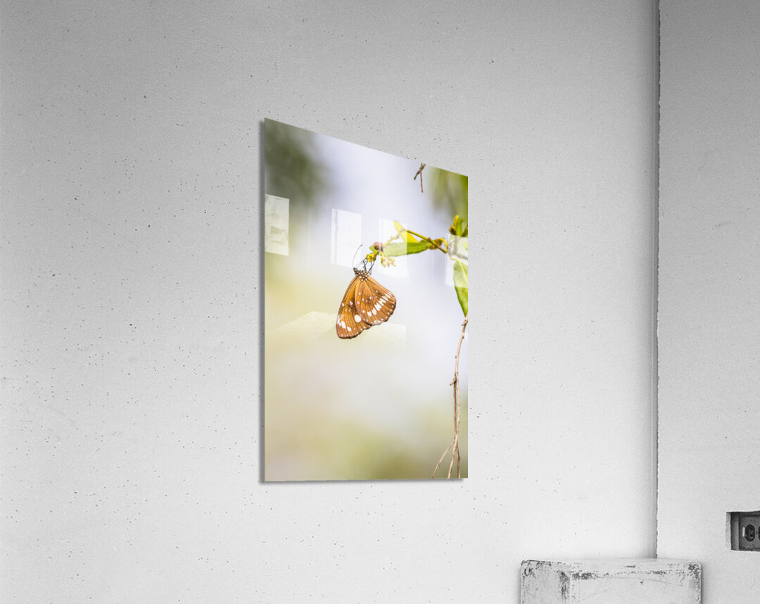 Nature fine art on a common crow butterfly hanging from foliage minimalism. Wild simplicity