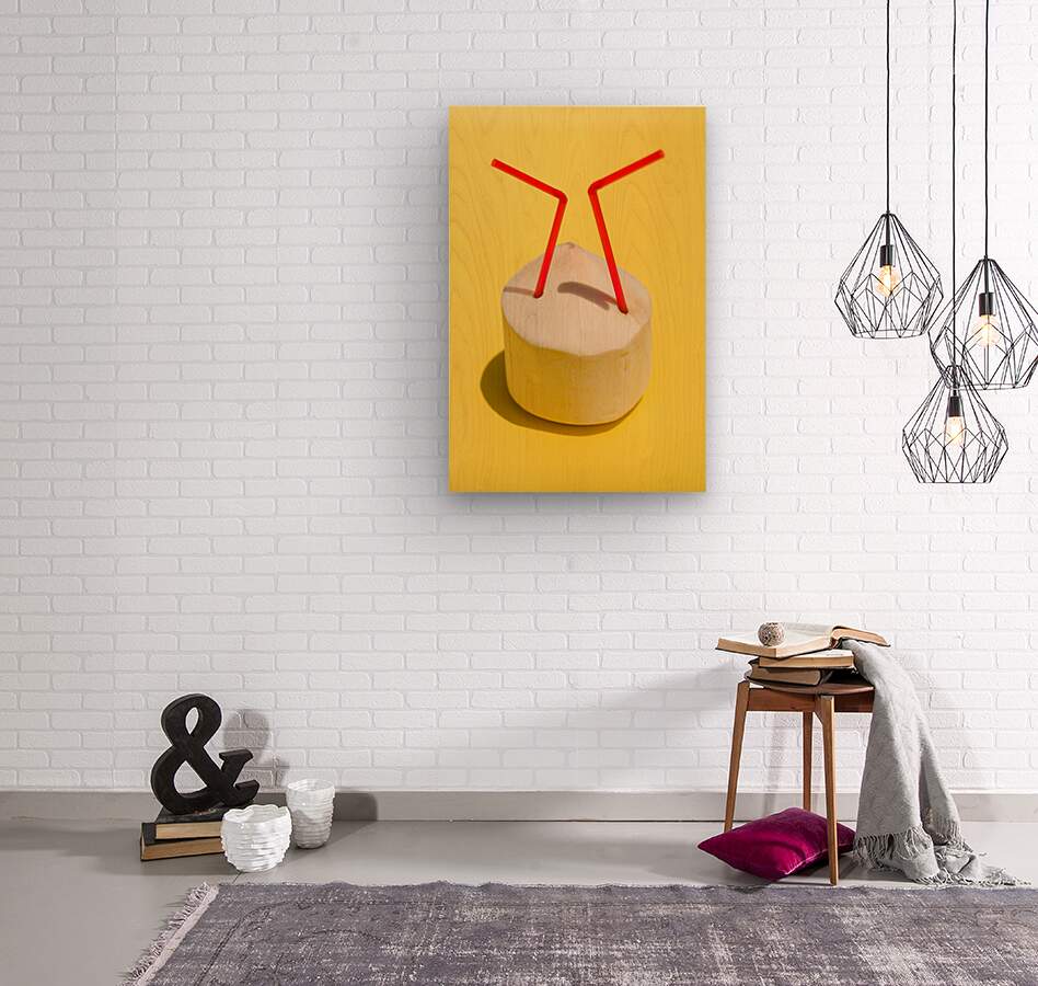 Coconut cocktail drink sitting on a summer yellow background with two sipping straws. Romantic summer holiday concept