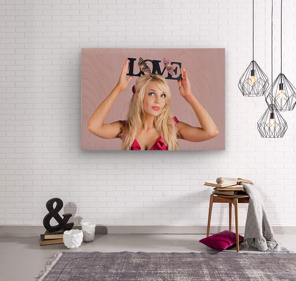 Attractive blond woman in pink dress holding love sign in upper case black text above her head decorated by butterflies on studio background