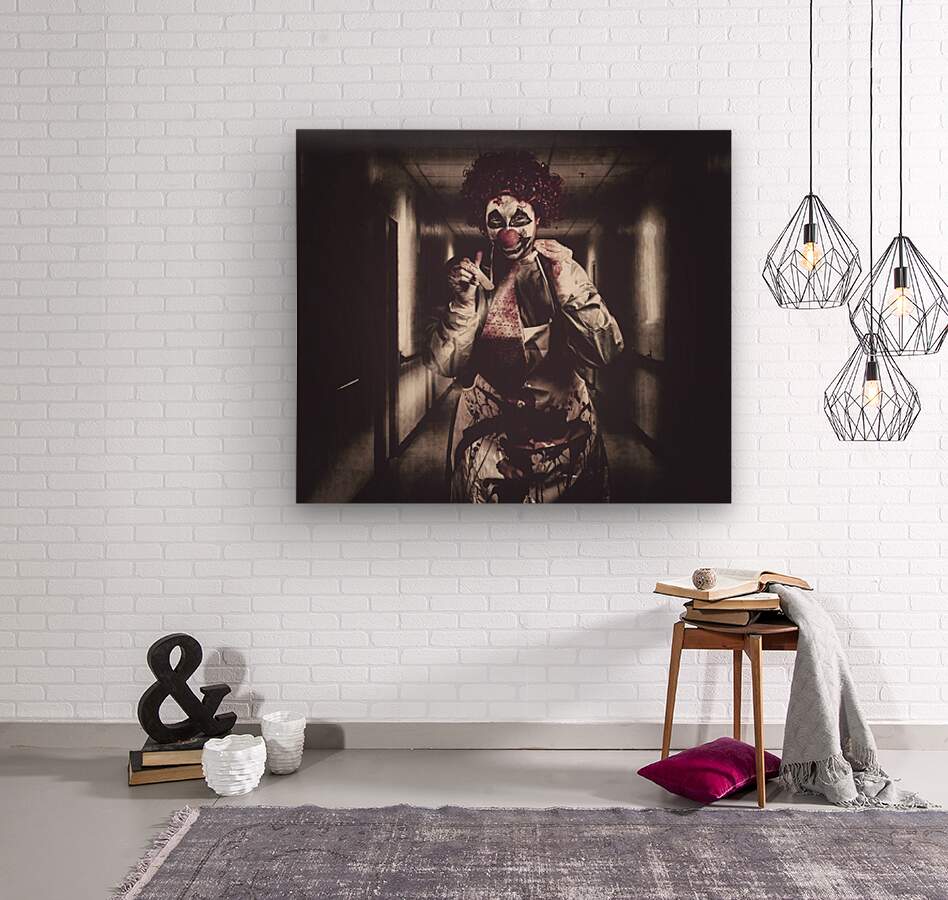 Creepy medical clown in grunge hospital hallway  Wood print