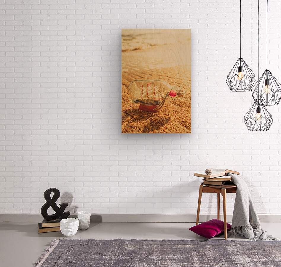 Maritime conceptual artwork of a nautical glass bottle boat by the sea. Still-life journey