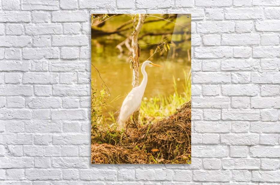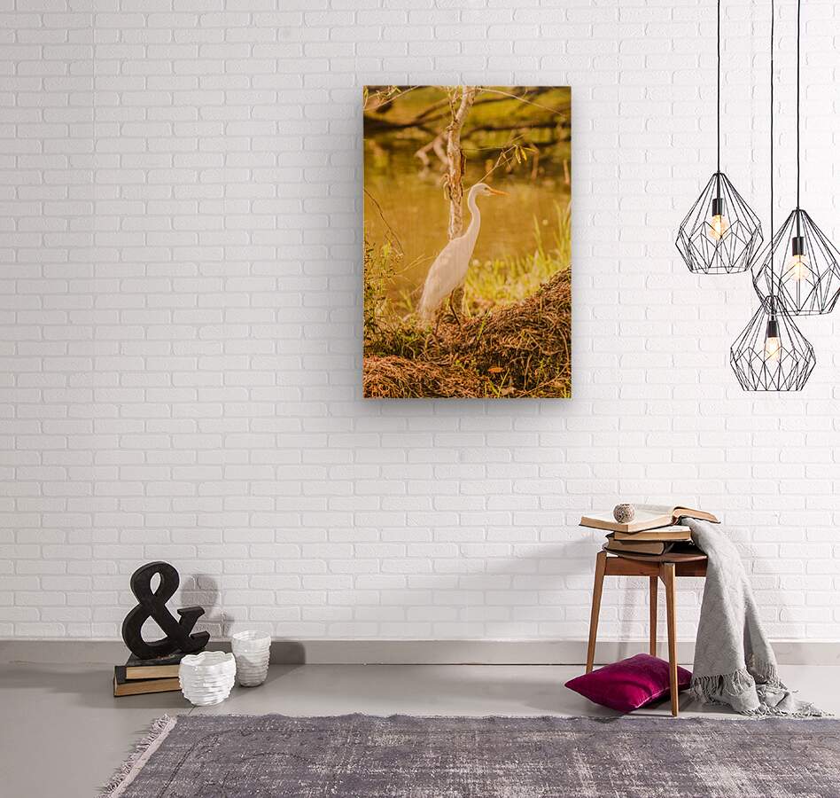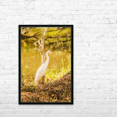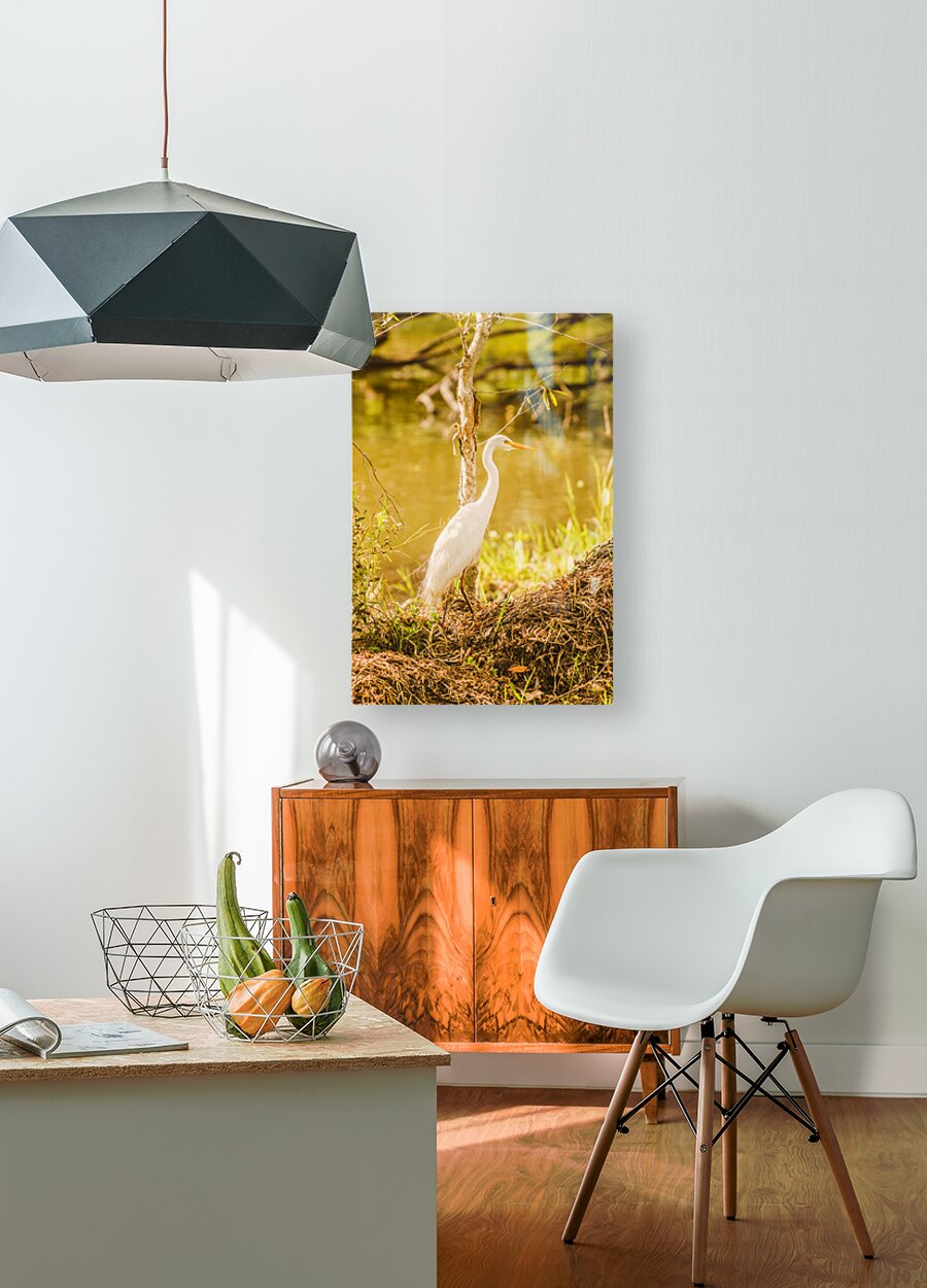 Golden dusk photography on a white Egret bird at tranquil waterway. Photographed: Murrumba Downs Queensland Australia