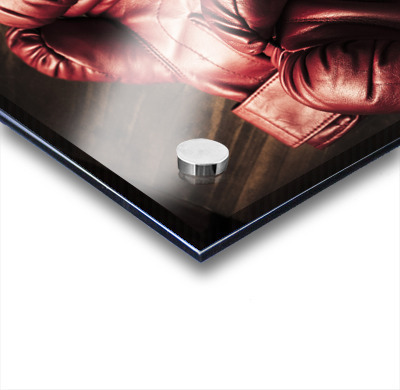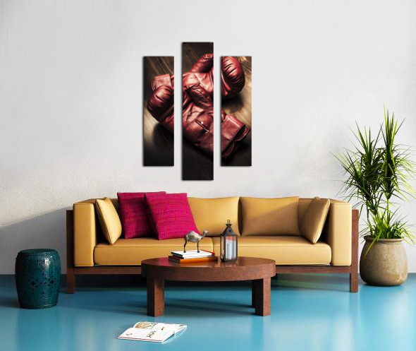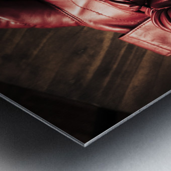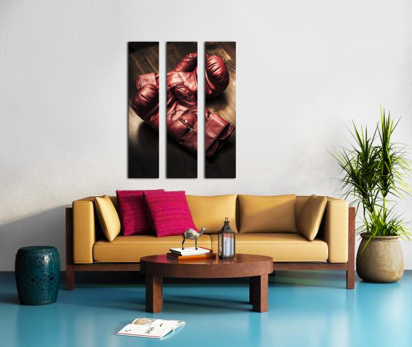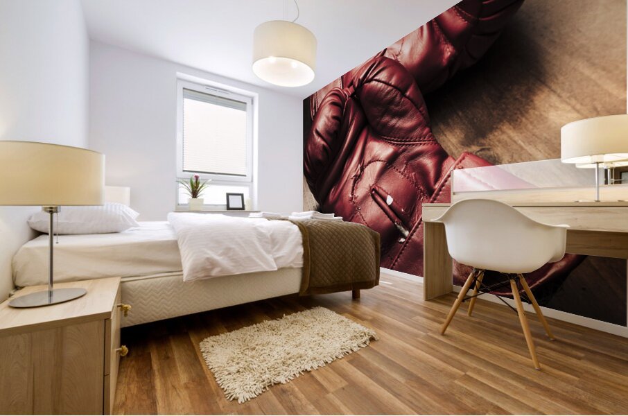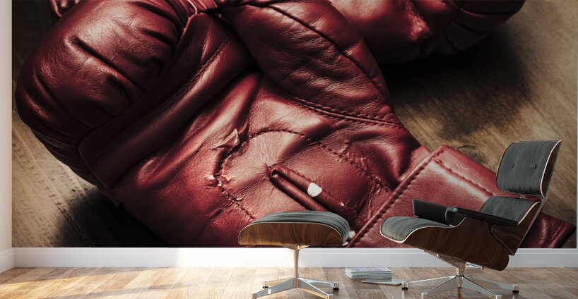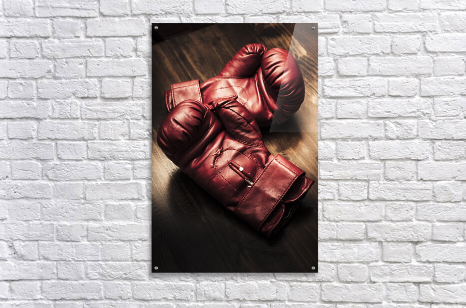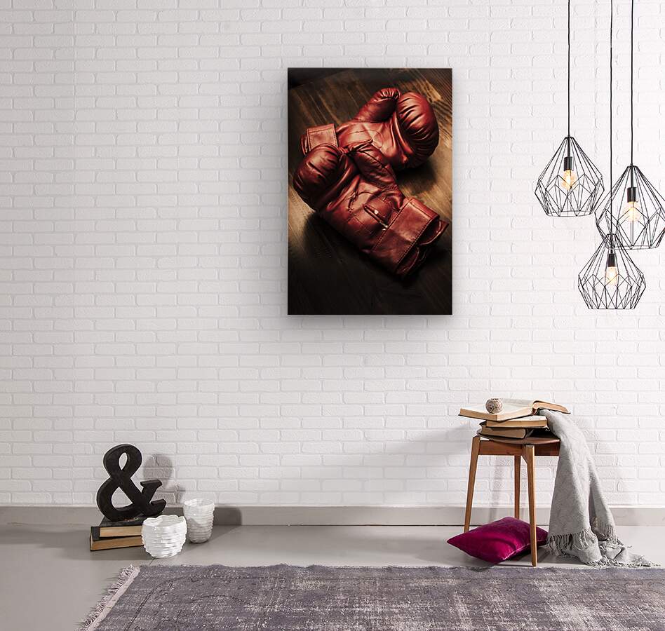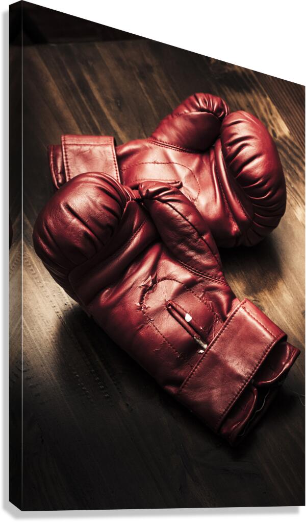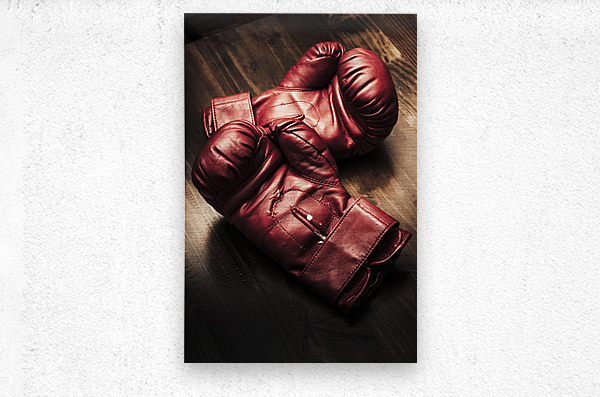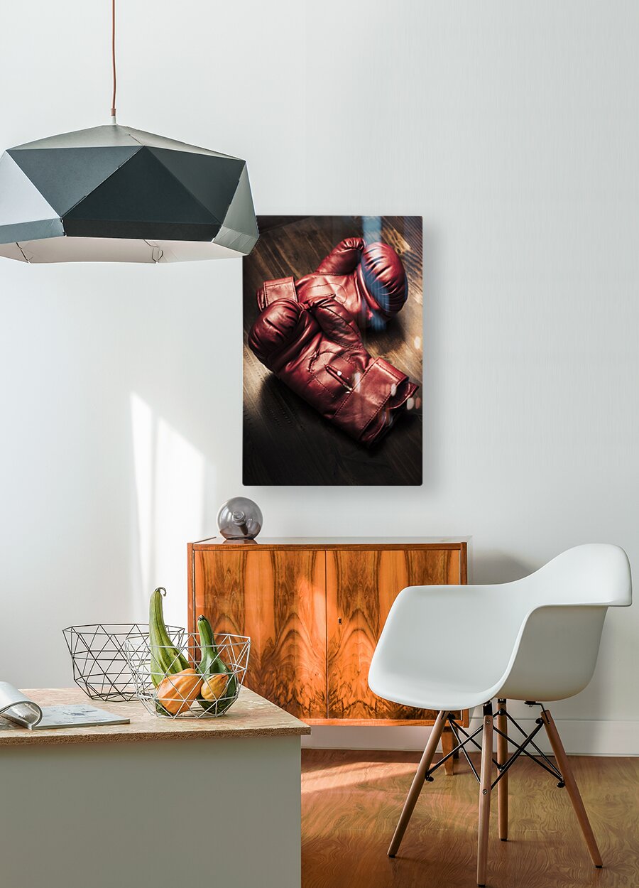 ABOUT THIS ARTWORK: RETRO RED BOXING GLOVES ON WOODEN TRAINING BENCH