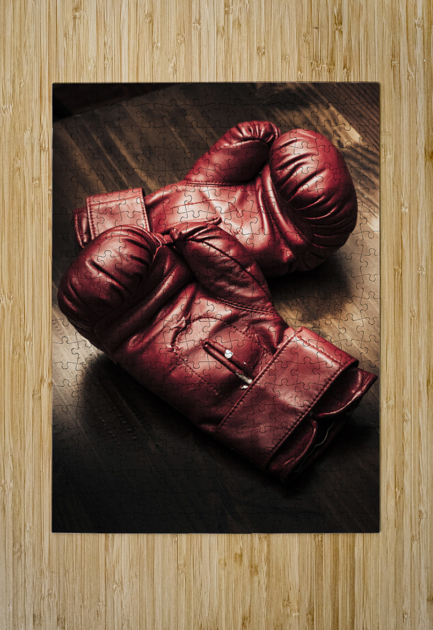 Retro red boxing gloves on wooden training bench Jorgo Puzzle printing