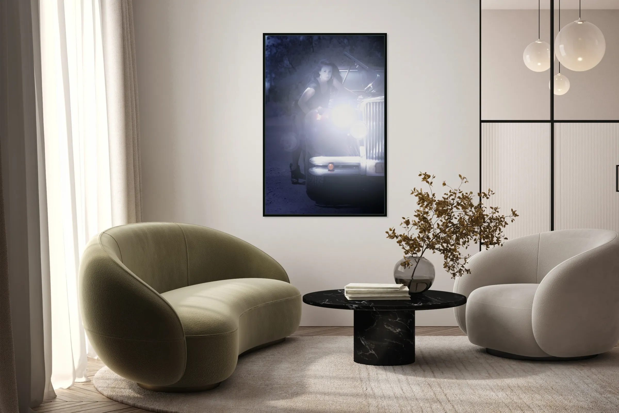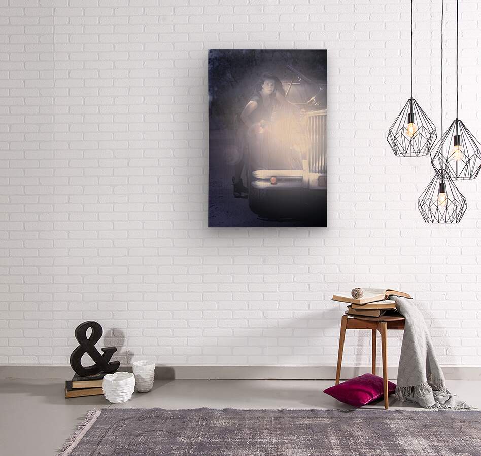 Dark blue twilight scene on a beautiful female mechanical working on a old classic Jaguar car. Midnight fix