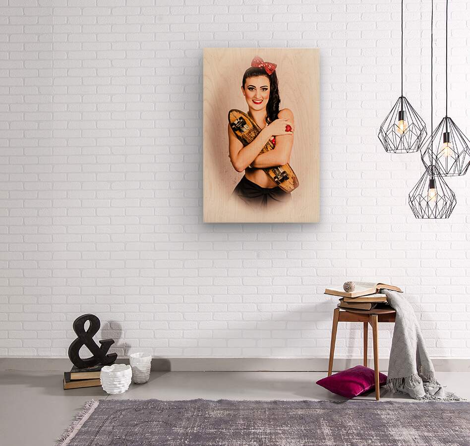 ABOUT THIS ARTWORK: VINTAGE PORTRAIT OF A PIN-UP MODEL WITH SKATEBOARD
